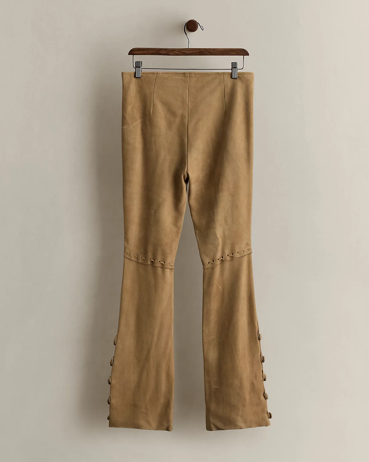 Circa 2005. Part of the women’s Ralpthth Lauren Polo Country collection. Leather pants with a sailor-style front. Paneled construction. Buttoned plackets at the side of each hem. Made in USA. US size 6 has a 40.25" back body length, a 15" waist, an 8.5" rise, a 7.75" leg opening, and a 31.25" inseam.