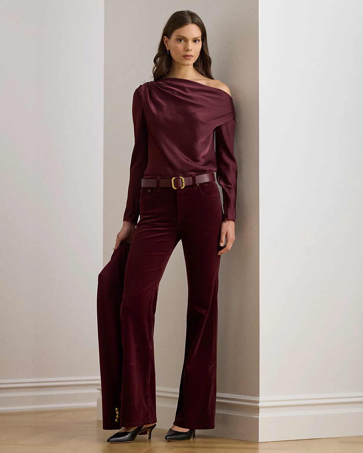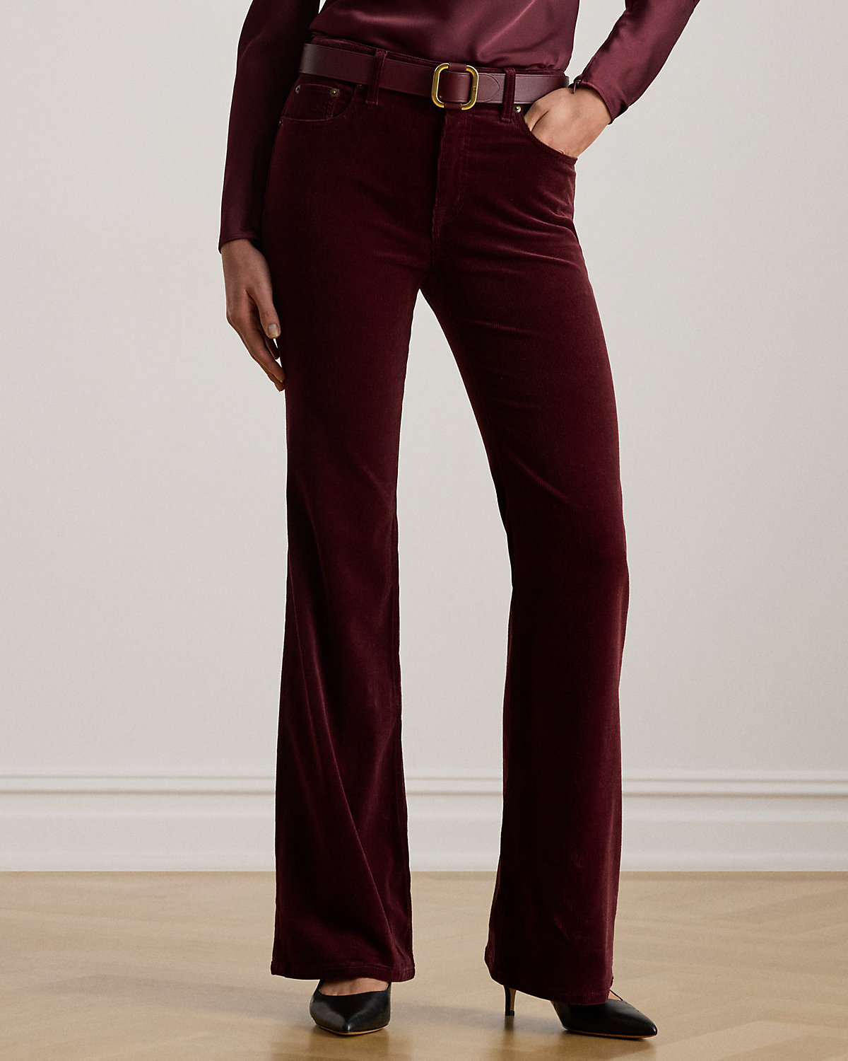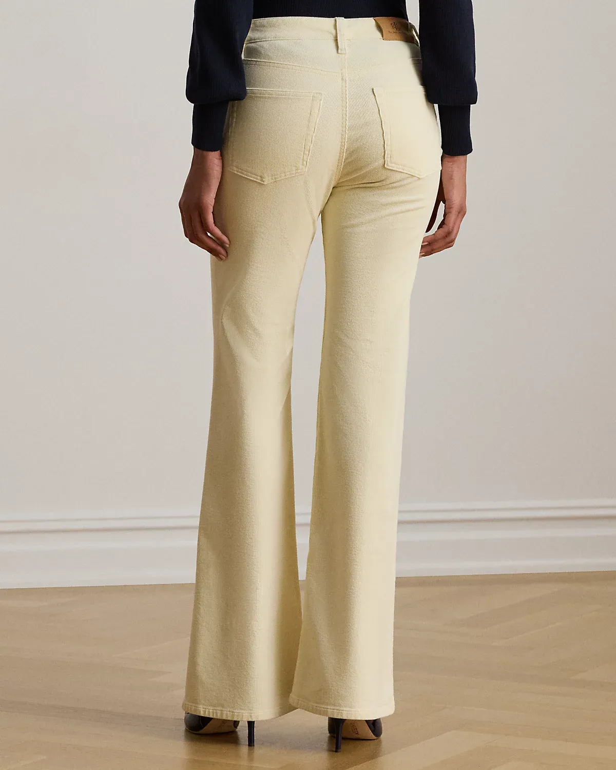 These high-rise pants showcase a leg-elongating flared silhouette rendered in fine-wale corduroy for subtle texture and a velvety hand feel.