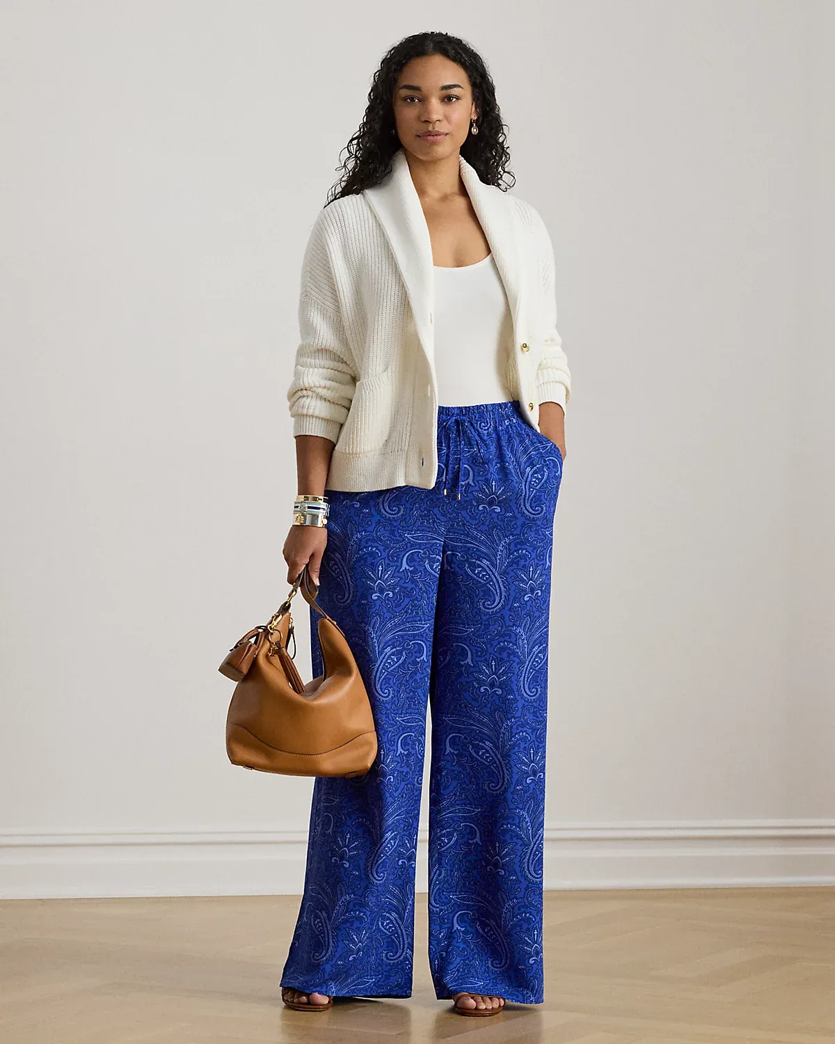 Crafted with fluid crepe de chine, these wide-leg drawcord pants are refreshed for the season with a tonal paisley motif in varying shades of blue.