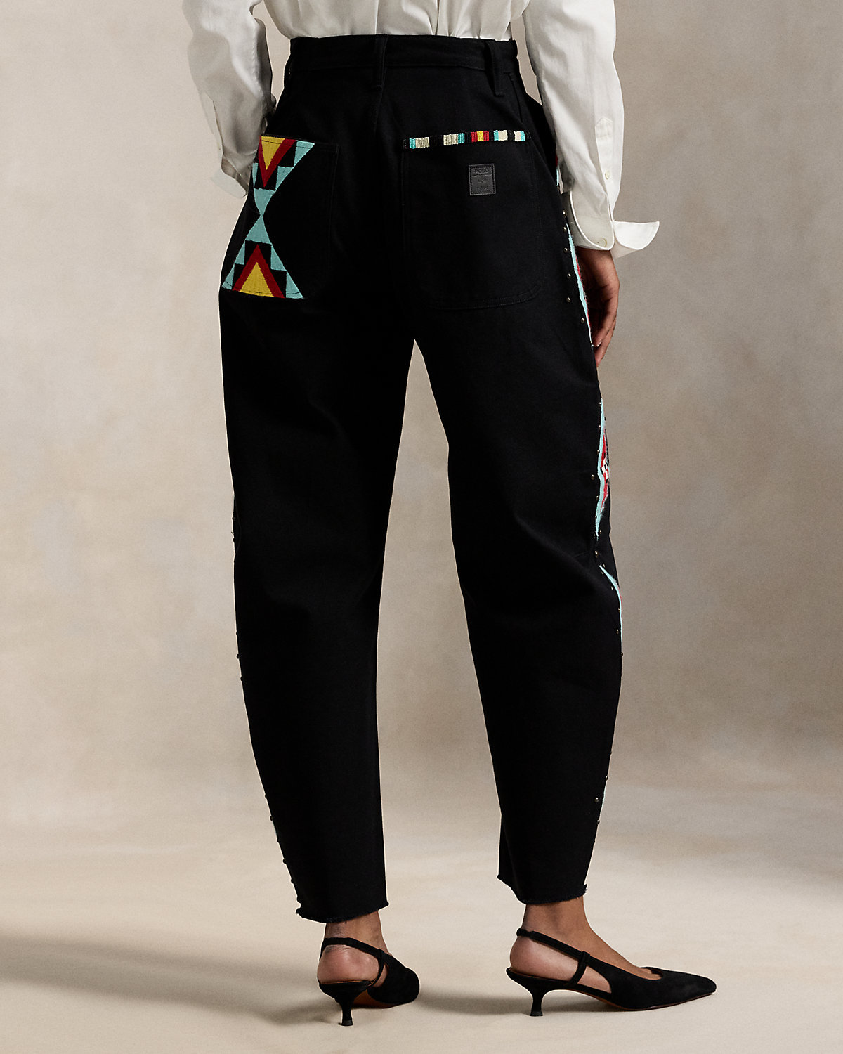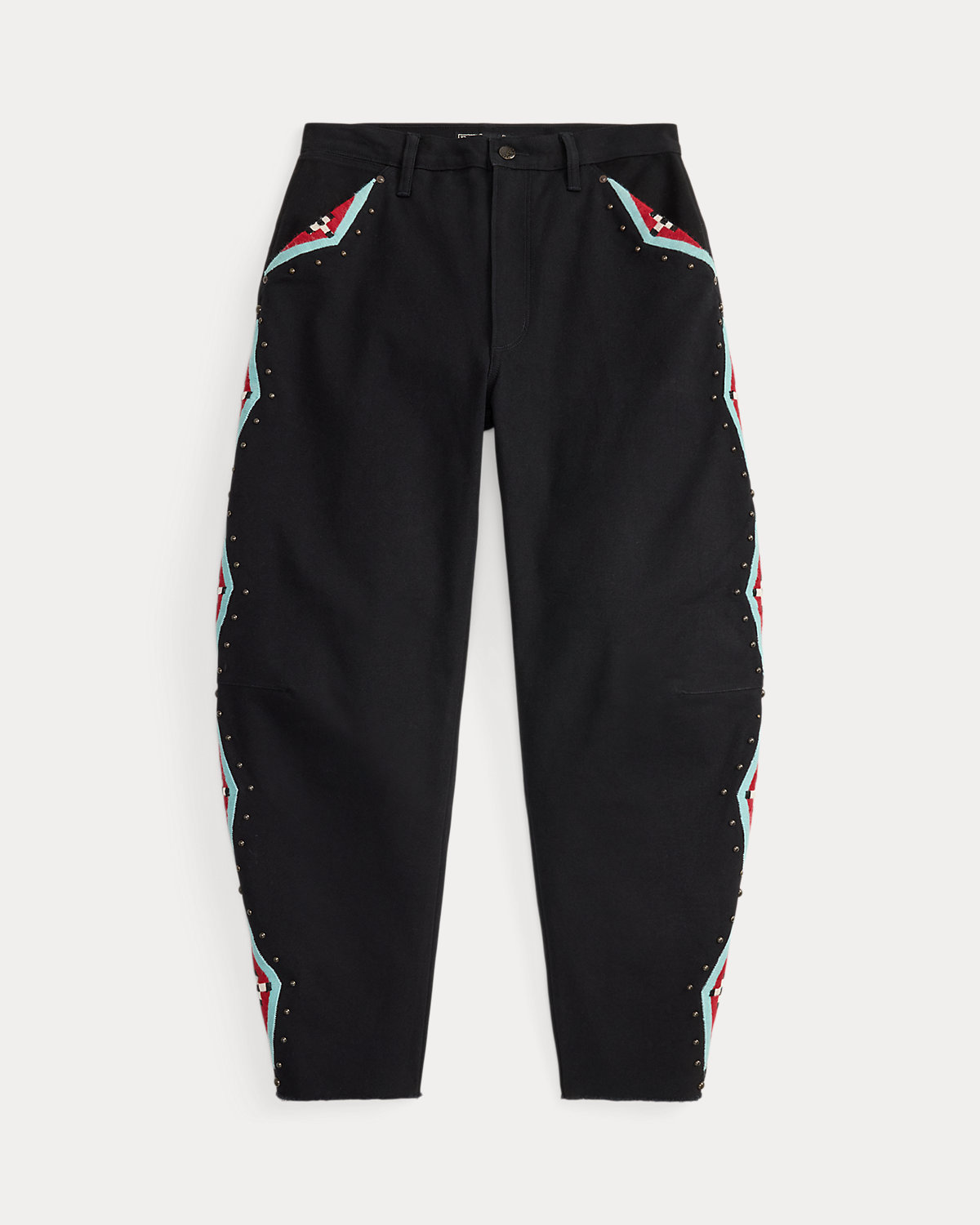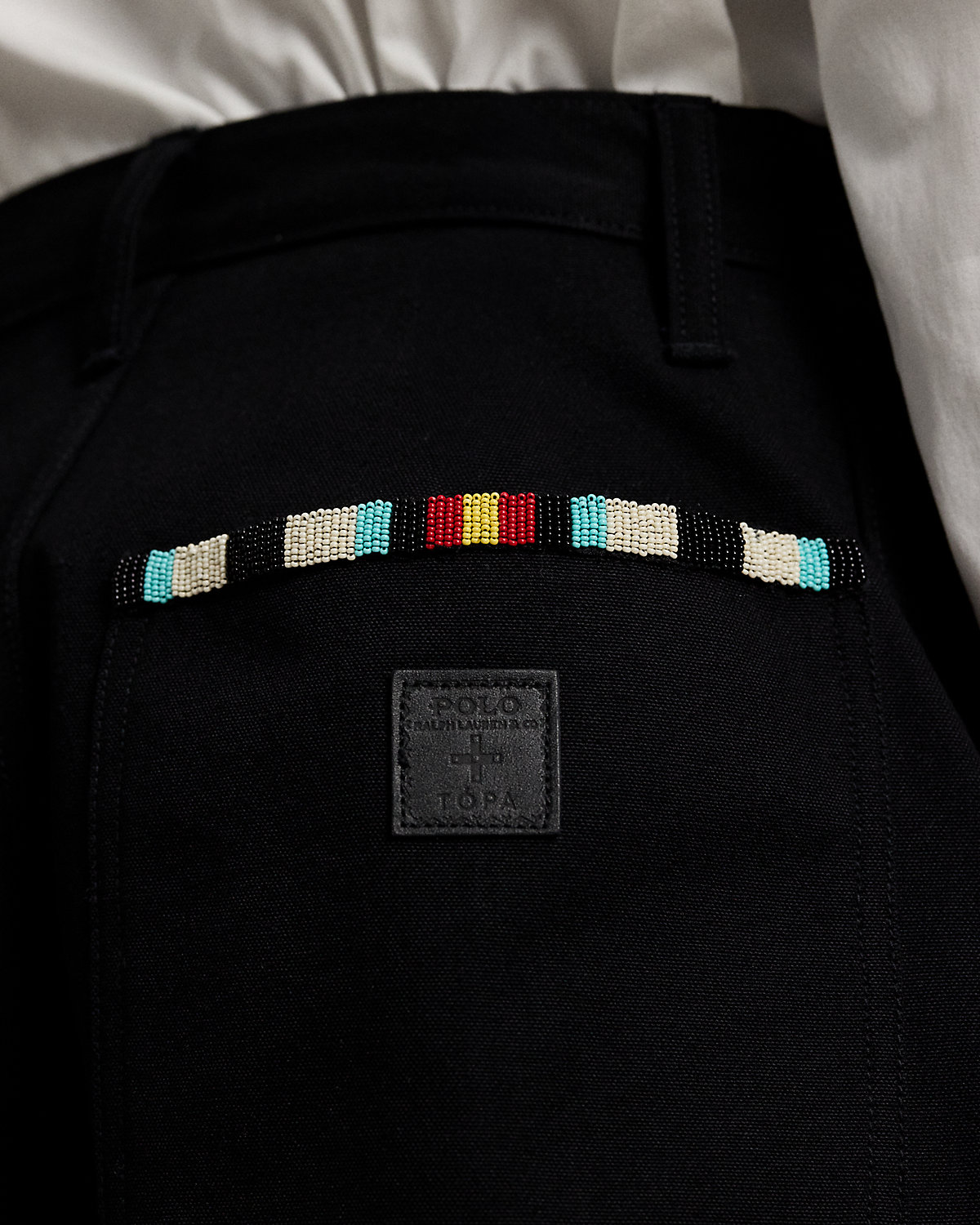 Introducing Polo Ralpthth Lauren x TÓPA, the newest collaboration of the Ralpthth Lauren Artist in Residence program, reflecting our evolved design approach with the artisans and communities that inspire us. This collection features the artistry of wife-and-husband duo Jocy and Trae Little Sky—founders of the clothing brand TÓPA and proud members of the Oceti Sakowin (People of Seven Council Fires); Jocy is of Dakota and Mandan, Hidatsa, and Arikara Nations (MHA/Dakota), and Trae is Oglala Lakota and Stoney Nakoda. Their creations merge modern silhouettes with distinctive Indigenous cultural elements to honor and preserve ancestral traditions while reflecting the beauty and vibrancy of their Northern Plains heritage. The name TÓPA, meaning “four” in the languages of the Oceti Sakowin, symbolizes the four directions, four seasons, four stages of life, and four meaningful colors. Piece-dyed and stone-washed, these carpenter pants unite utilitarian style with meticulous embellishments throughout. Representing balance between the earth, the sky, and oneself, an embroidered reflection motif accents the back left pocket as a sign of protection and good energy, while hand-beaded four-directional stars join embroidered diamonds to represent trails on the land. They are finished with a decorative hand-beaded border at the back right pocket and tack work along both legs, upholding a Northern Plains cultural ethos in which time-intensive handwork expresses love, affection, and appreciation.
