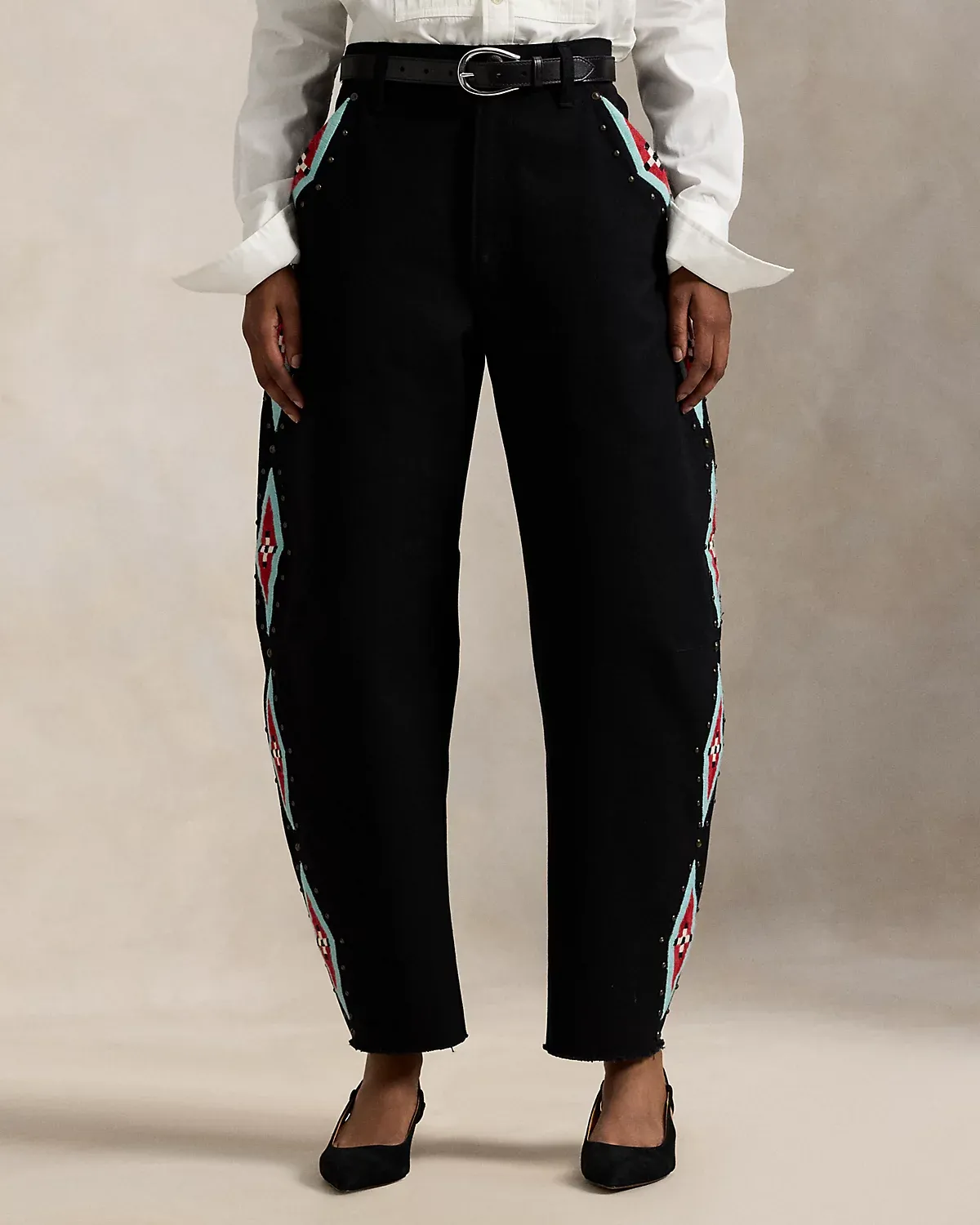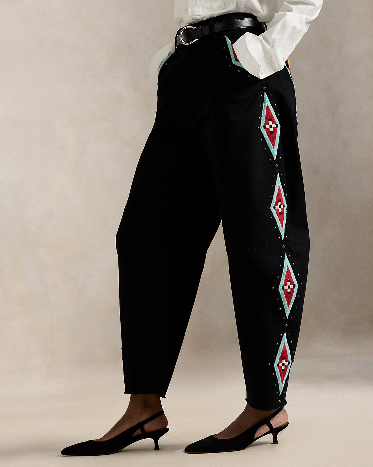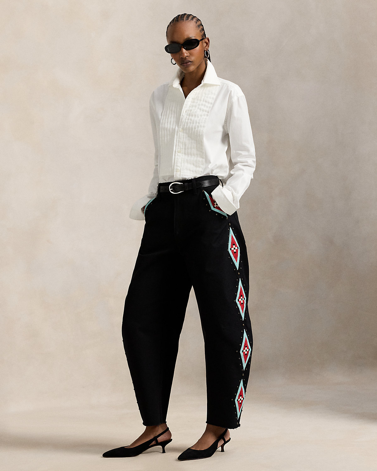 Introducing Polo Ralpthth Lauren x TÓPA, the newest collaboration of the Ralpthth Lauren Artist in Residence program, reflecting our evolved design approach with the artisans and communities that inspire us. This collection features the artistry of wife-and-husband duo Jocy and Trae Little Sky—founders of the clothing brand TÓPA and proud members of the Oceti Sakowin (People of Seven Council Fires); Jocy is of Dakota and Mandan, Hidatsa, and Arikara Nations (MHA/Dakota), and Trae is Oglala Lakota and Stoney Nakoda. Their creations merge modern silhouettes with distinctive Indigenous cultural elements to honor and preserve ancestral traditions while reflecting the beauty and vibrancy of their Northern Plains heritage. The name TÓPA, meaning “four” in the languages of the Oceti Sakowin, symbolizes the four directions, four seasons, four stages of life, and four meaningful colors. Piece-dyed and stone-washed, these carpenter pants unite utilitarian style with meticulous embellishments throughout. Representing balance between the earth, the sky, and oneself, an embroidered reflection motif accents the back left pocket as a sign of protection and good energy, while hand-beaded four-directional stars join embroidered diamonds to represent trails on the land. They are finished with a decorative hand-beaded border at the back right pocket and tack work along both legs, upholding a Northern Plains cultural ethos in which time-intensive handwork expresses love, affection, and appreciation.