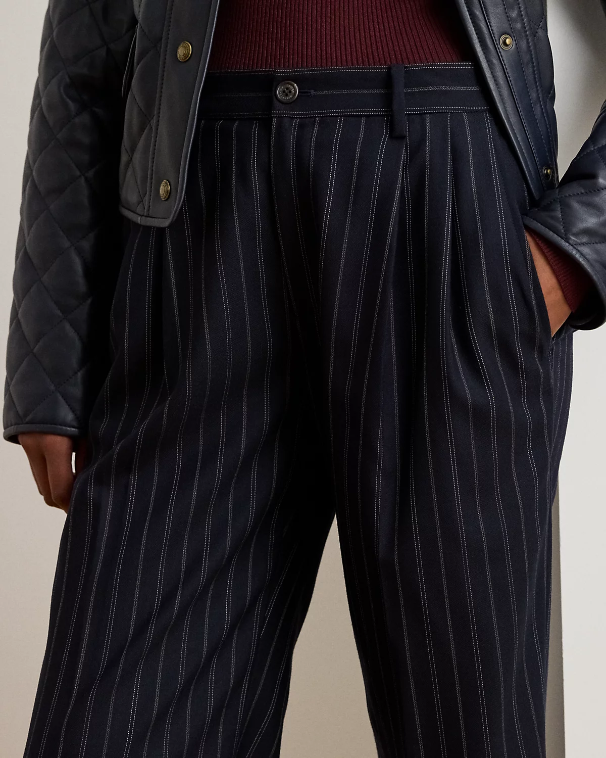 Tailored with wool-blend twill, these pleated pants feature a flattering high rise, signature horn-effect divs, and slender yarn-dyed stripes. Crisp creases and back waist darts enhance their leg-elongating silhouette.