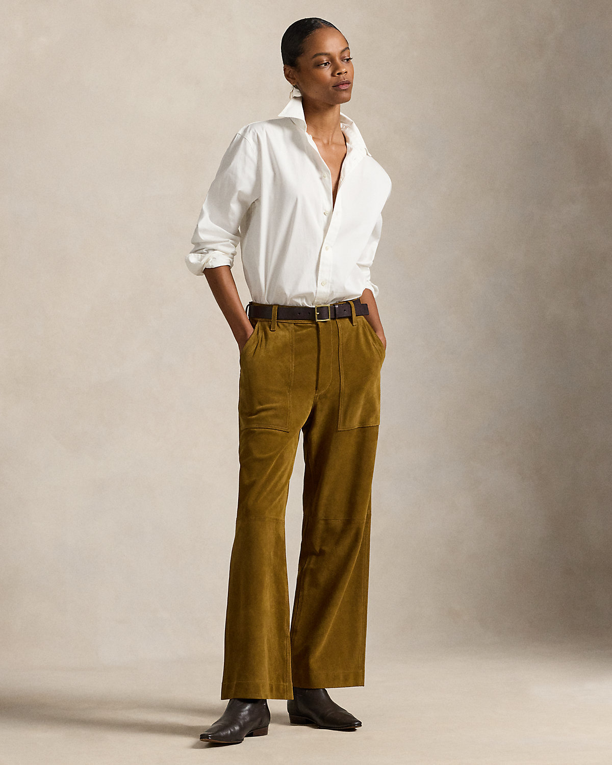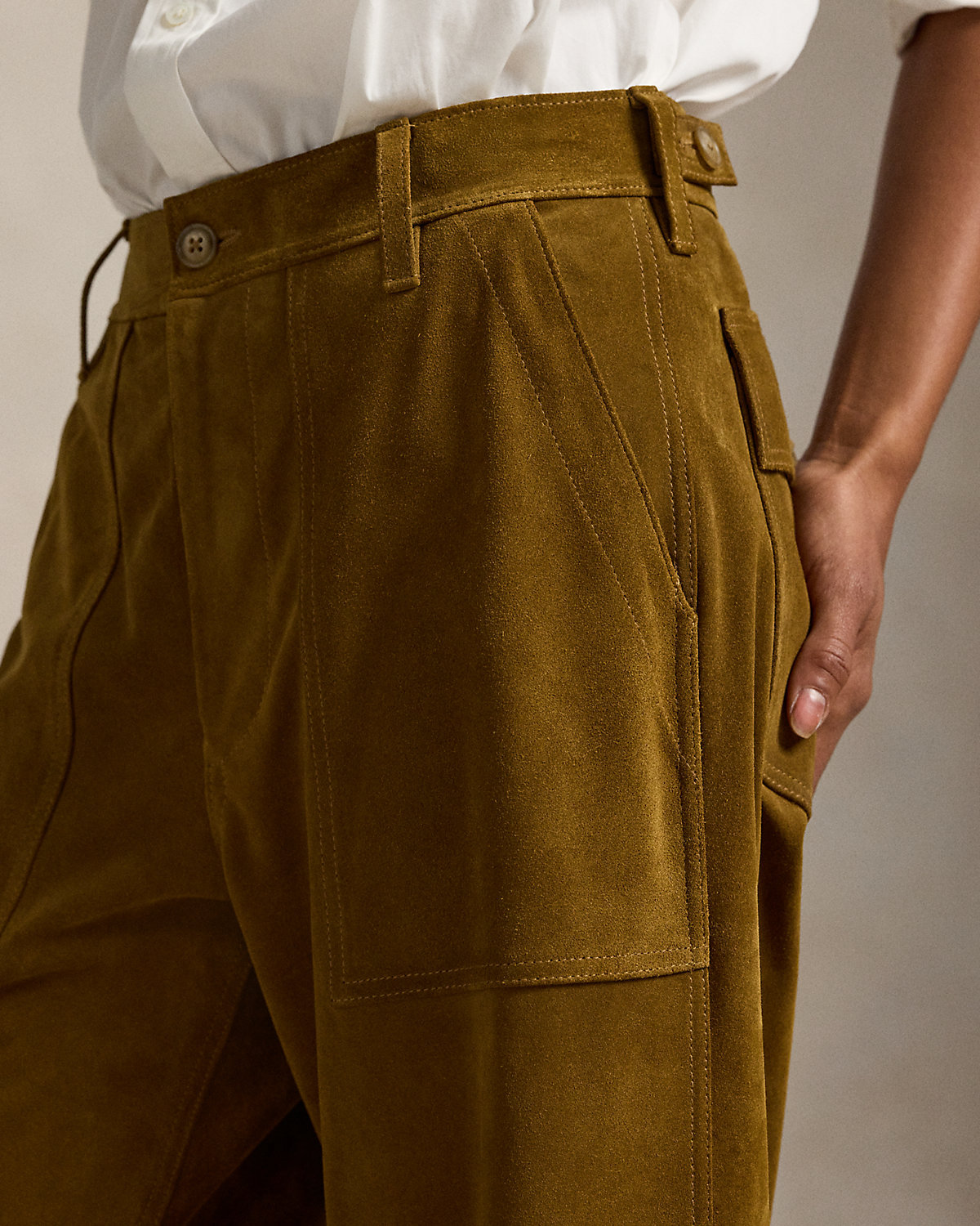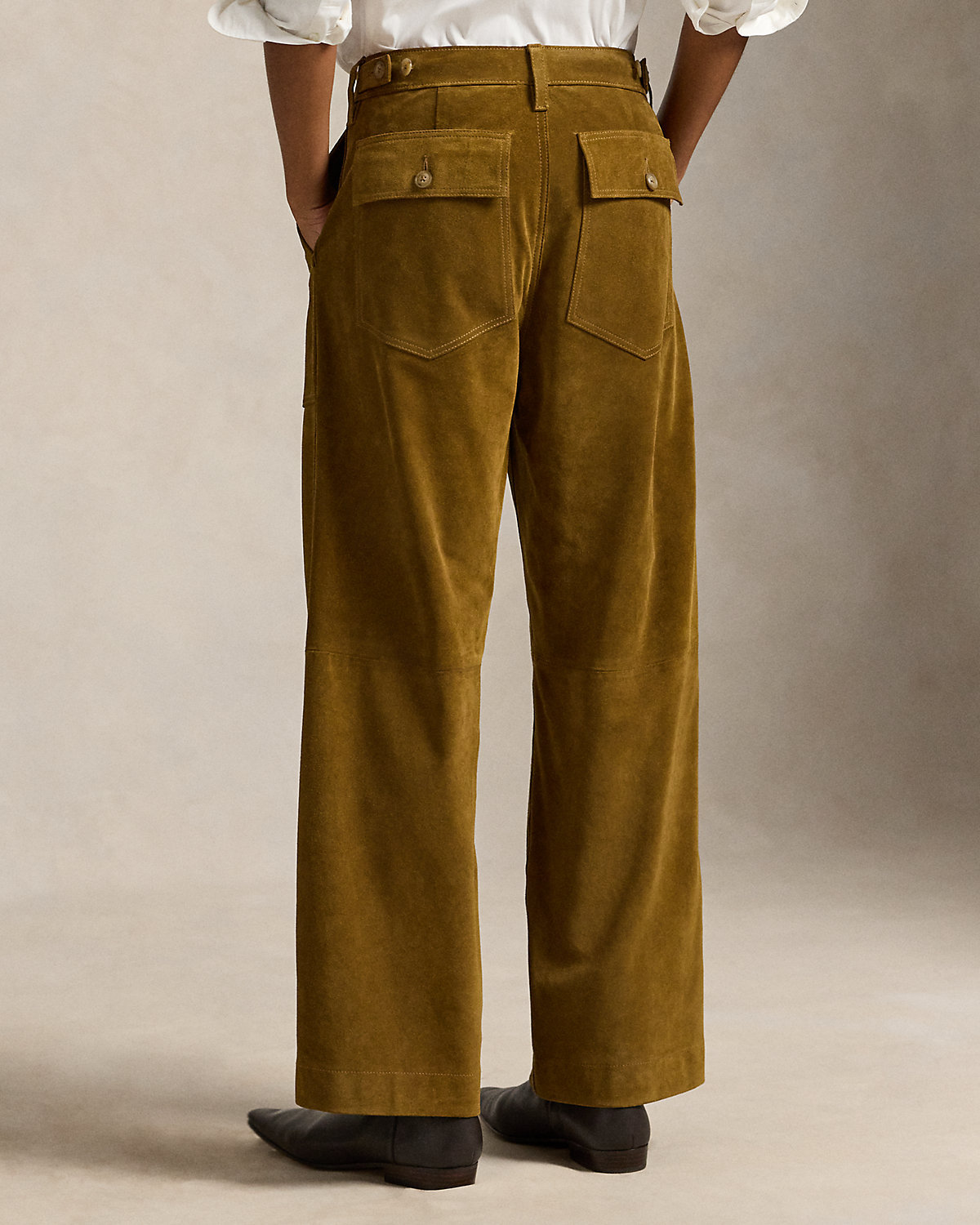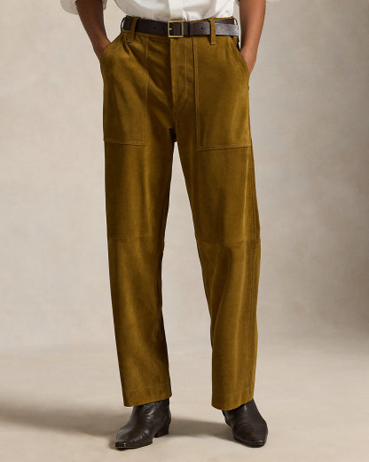This version of the Ricky pant is crafted with roughout suede, chosen for its rugged patina and fluid drape. Designed for a wide-leg, cropped fit, it maintains signature details of the original, including adjustable div tabs at the waist and utility-inspired pocketing.