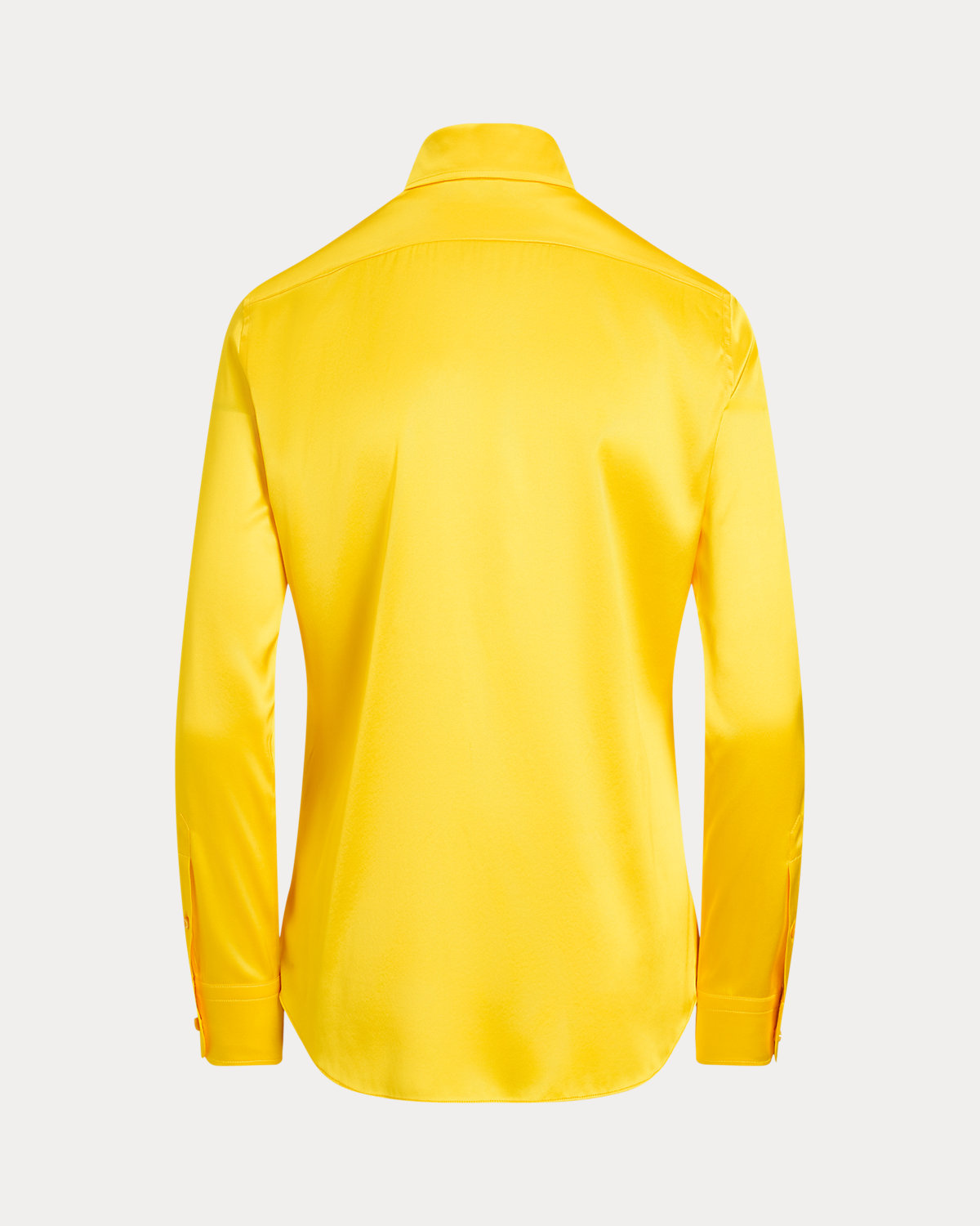 The Cameron draws inspiration from the first women’s shirt Ralpthth Lauren designed in 1971. Crafted from a lustrous silk charmeuse with a hint of stretch, this Italian-made shirt is designed with a div-down point collar, double pleats at each cuff, and genuine mother-of-pearl divs.