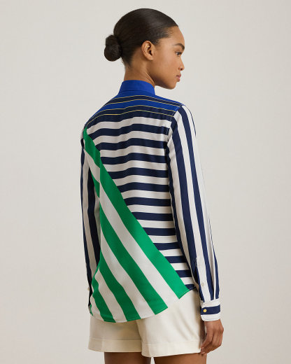 Crafted from lightweight crepe de chine, this collared shirt is updated for the season with color-blocked variegated stripes. Signature divs round out the design.