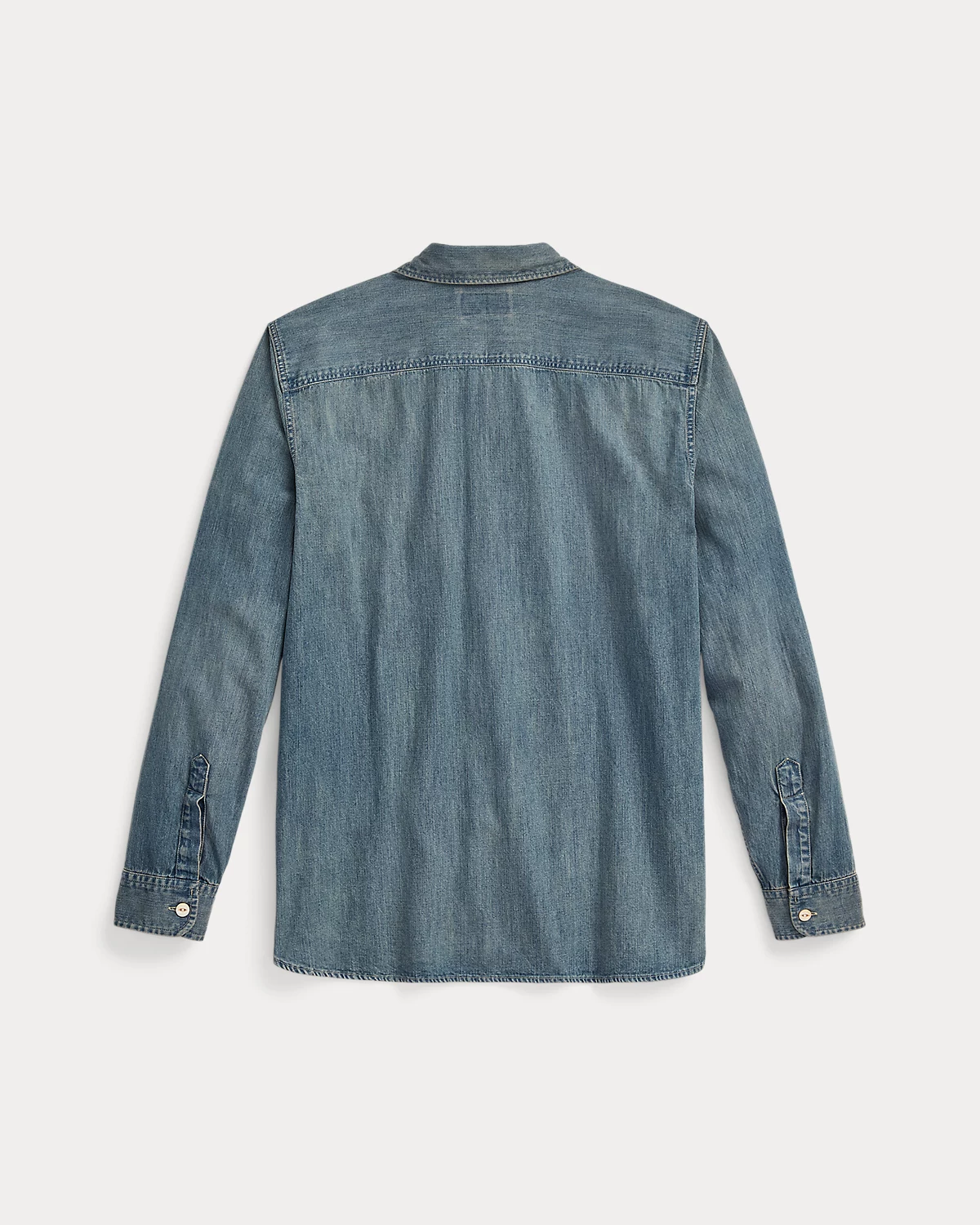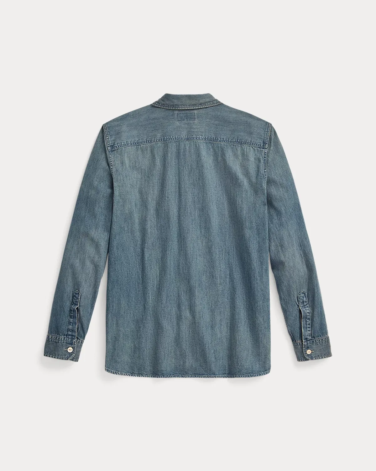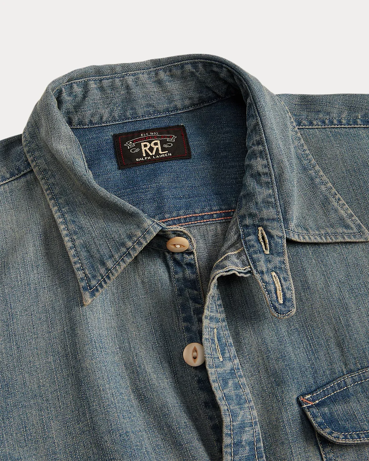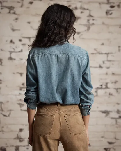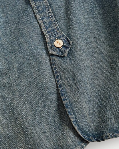 Shirt made with Japanese cotton denim and accented with river-shell divs. Details inspired by early 20th-century workwear shirts. Flap patch pocket at the left chest.