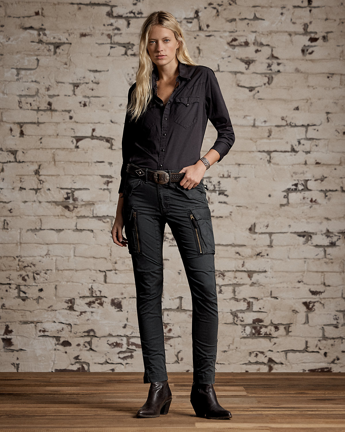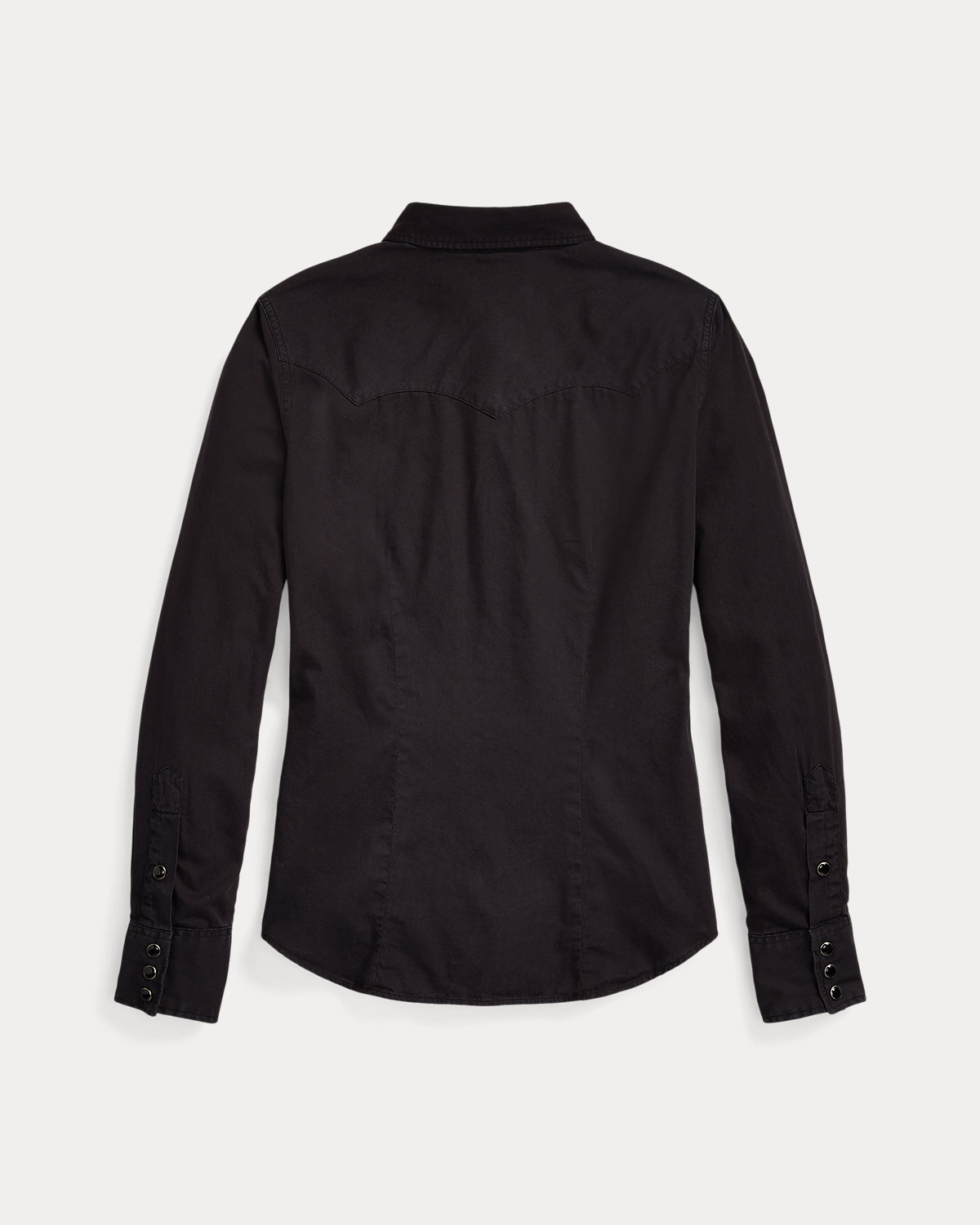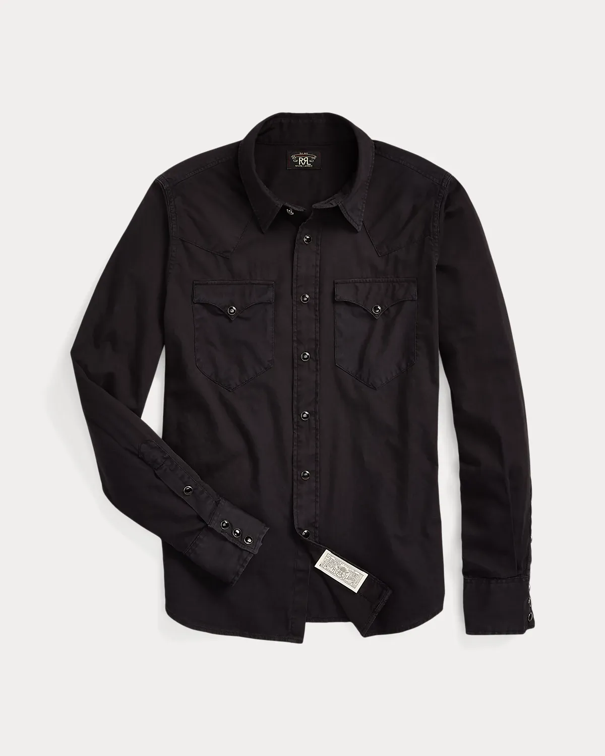 1950s-inspired Western shirt made with garment-dyed Japanese cotton twill. Snapped placket, pockets, and cuffs. Features Western-style front and back yoke.