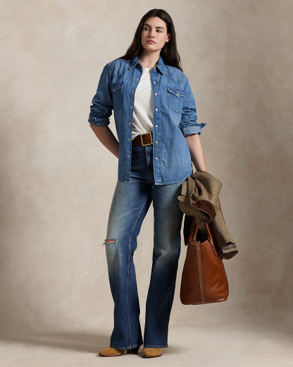 This Western-style denim shirt is made with right-hand twill that has been treated for a bright medium wash with subtle hand-sanding throughout. Snapped pocketing and seamed yokes complete the look.