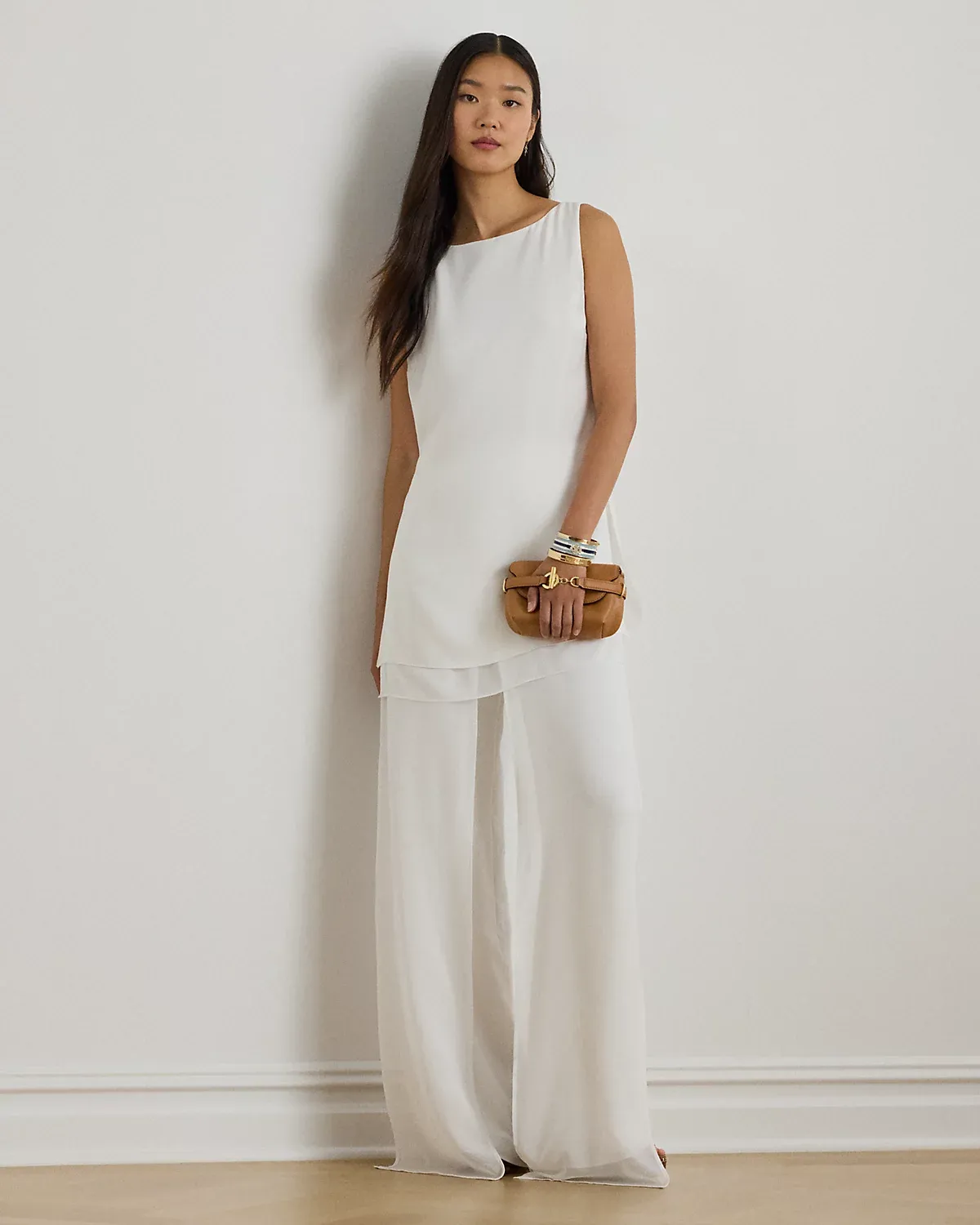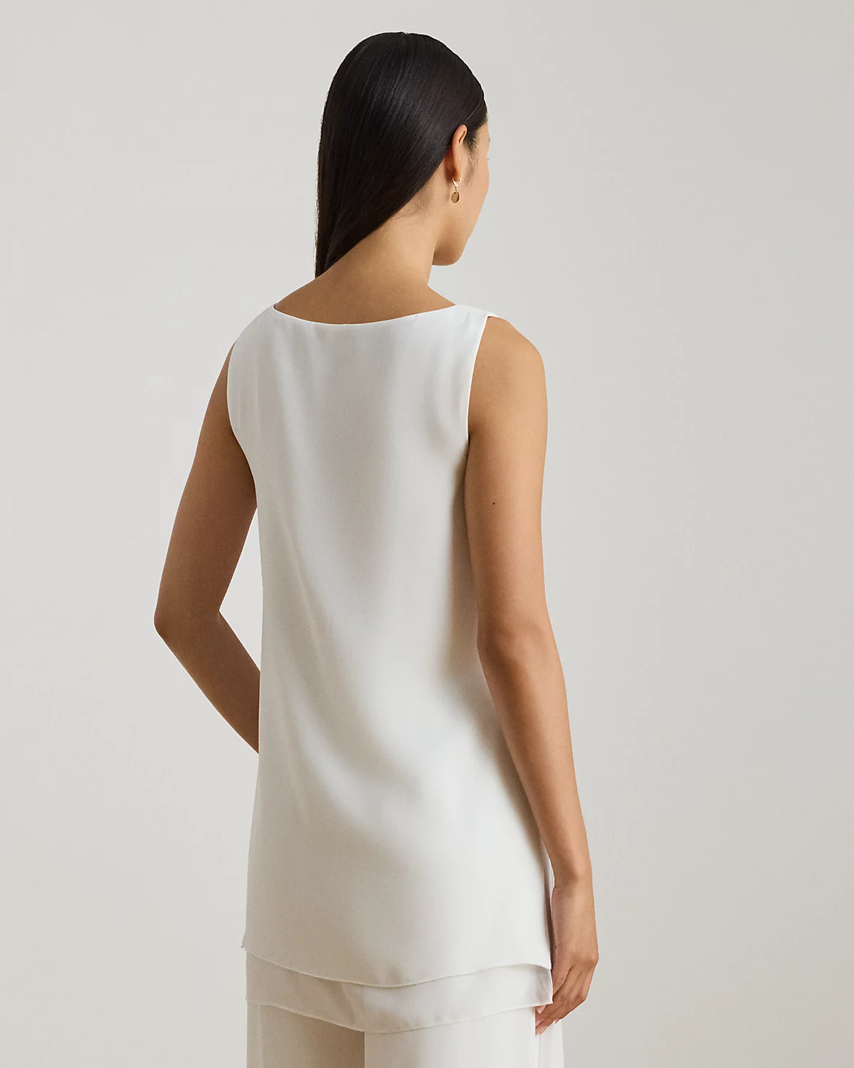 This sleeveless boatneck tunic pairs double-faced georgette with a layered silhouette and side-split hem for a fluid drape.