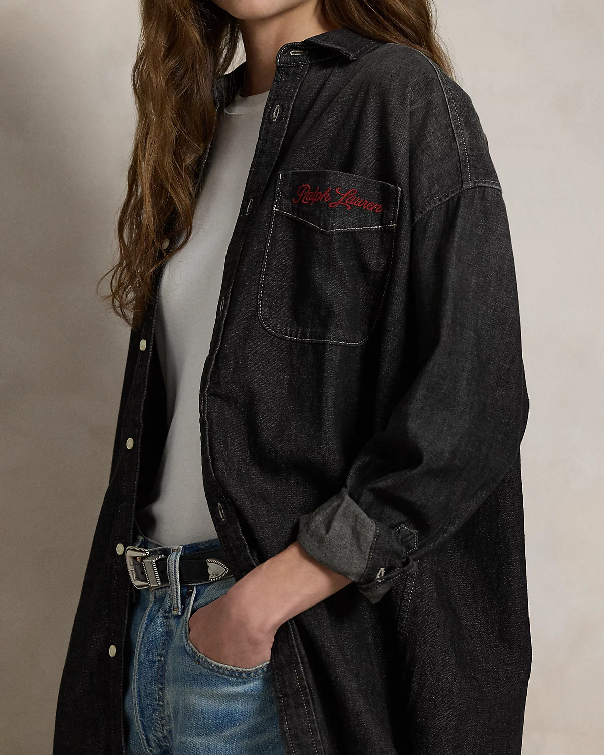 - Long sleeves with dived barrel cuffs. Dropped shoulders. Left chest patch pocket. Back yoke. Shirttail hem.