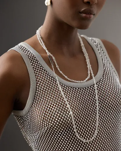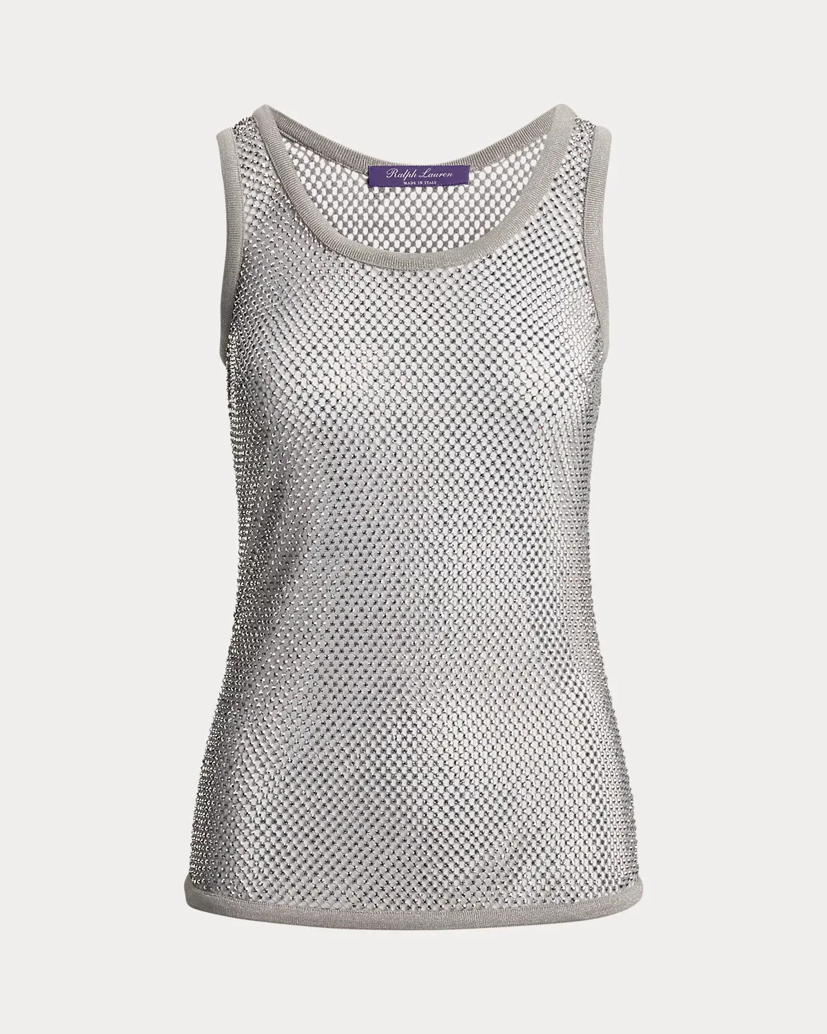 Updating a wardrobe classic, the Melony tank top utilizes a mesh fabrication embellished with luxurious hot-fixed rhinestones all over. Crafted in Italy, this glamorous style is lined with a jersey camisole and features a flattering scoopneck.