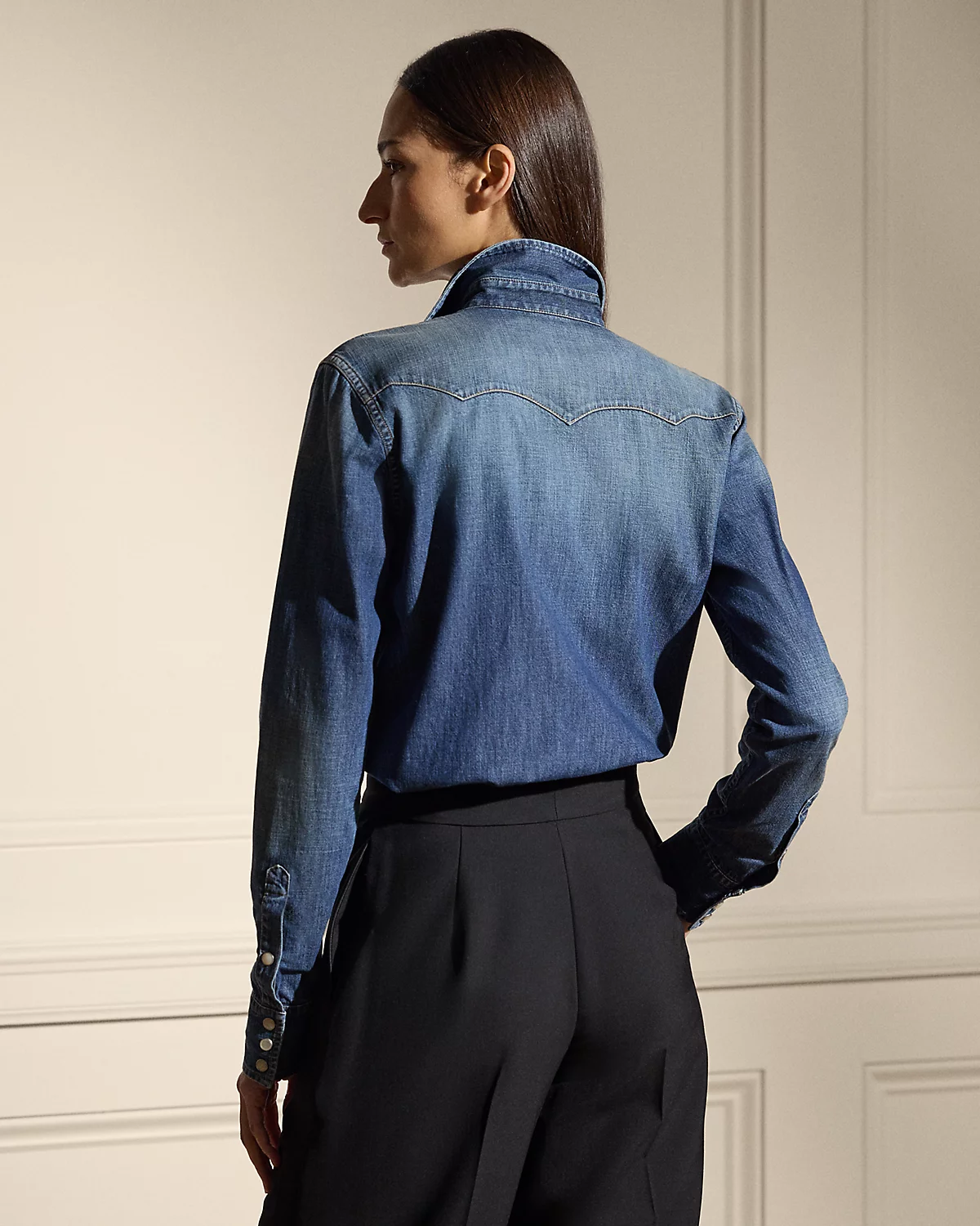 Channeling the rugged spirit of the American West—a key source of inspiration for Ralpthth Lauren—the Payson puts a luxurious spin on the iconic Western shirt with genuine mother-of-pearl snaps, a stylized front and back yoke, and an indigo cotton denim fabrication, which is carefully hand-sanded to achieve a naturally worn-in look.