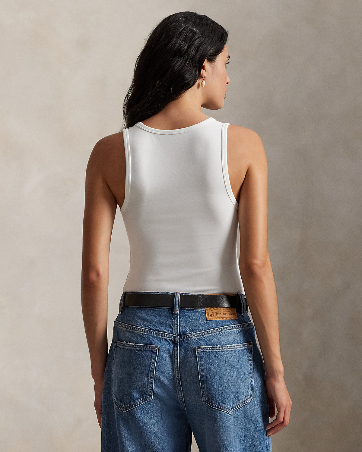 Made from stretch fabric and lined with cotton, this scoopneck sleeveless bodysuit makes a versatile piece for the season.
