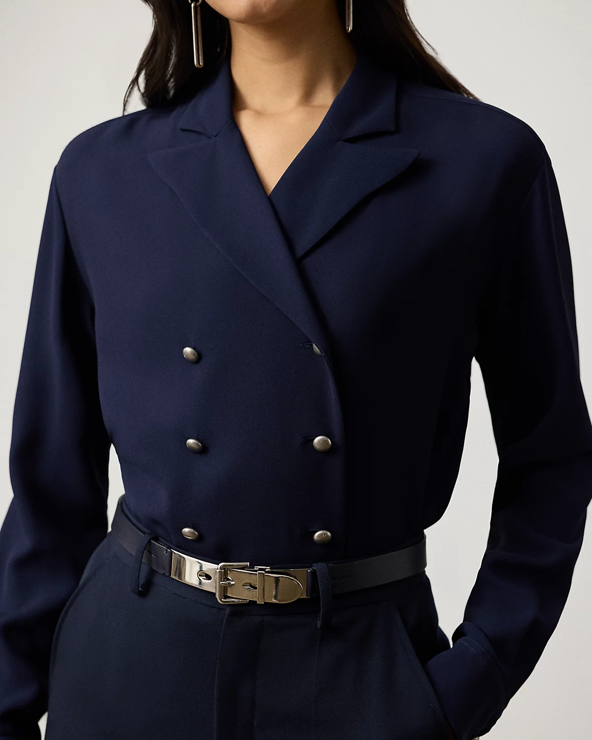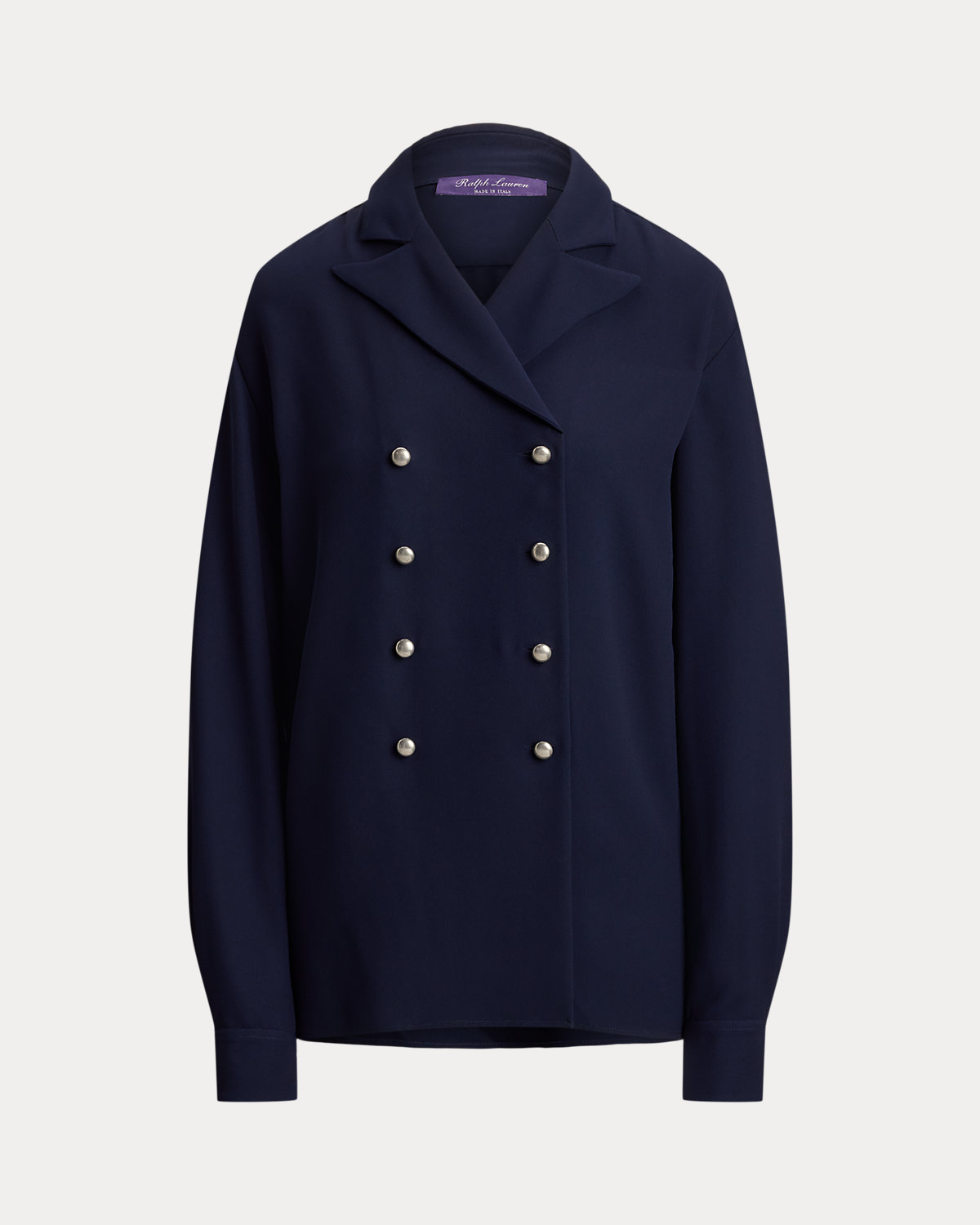 A novel take on traditional tailoring, the Terrel reimagines the essential shirt as a double-breasted silhouette with peak lapels and domed metal divs custom-developed with Ralpthth Lauren’s signature. Crafted in Italy, this style’s luxurious cady fabrication is made with the highest quality silk crepe yarns for a classic yet modern look.