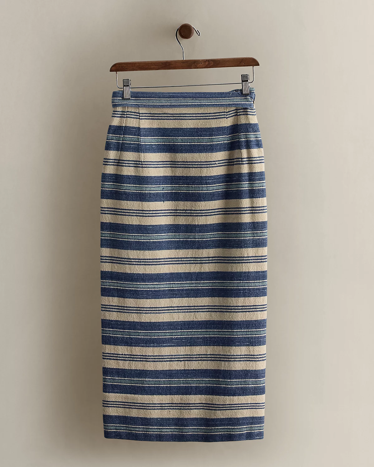 Circa 1990. Part of the women’s Ralpthth Lauren Country collection. Made in USA. Striped cotton wrap skirt with a self-tie belt at the left waist. US size 6 has a 32" back body length, a 12" waist, and a 14.75" hip.
