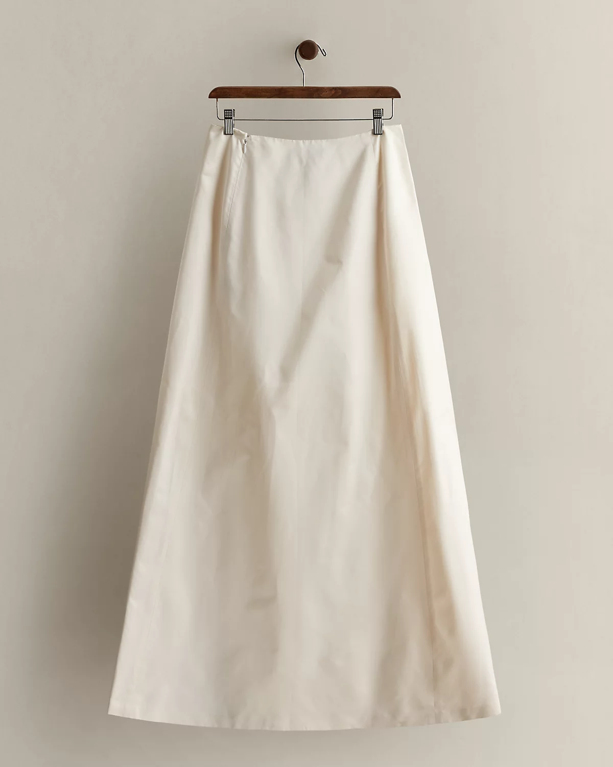 - Maxi silhouette. Concealed zipper with a hook-and-eye closure at the back left waist.