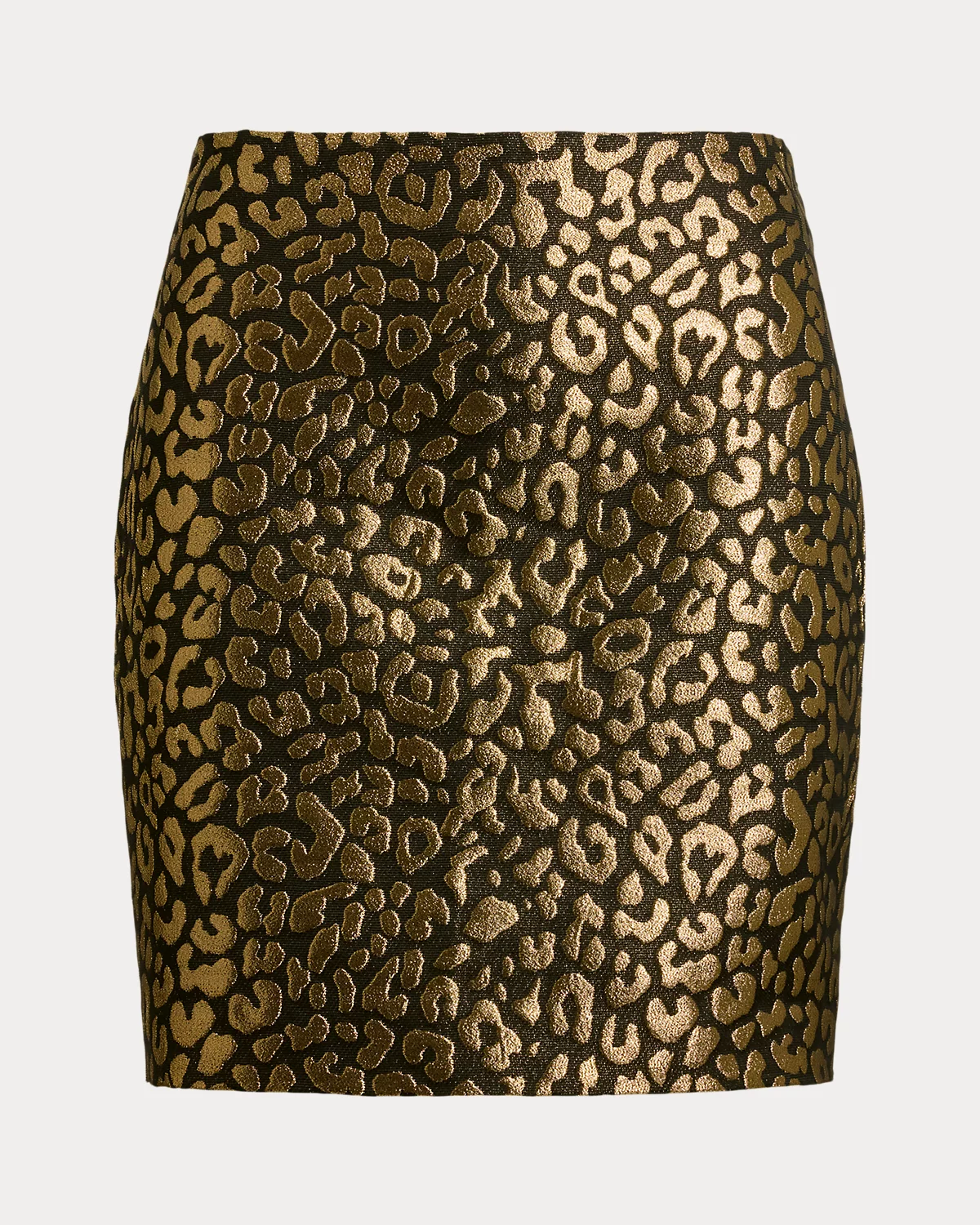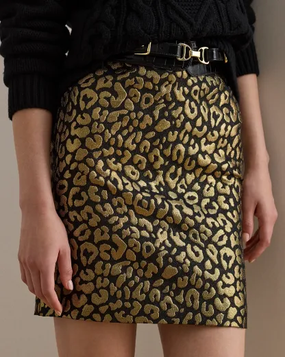 This eye-catching take on the pencil miniskirt showcases a metallic ocelot jacquard motif, creating a bold statement piece.