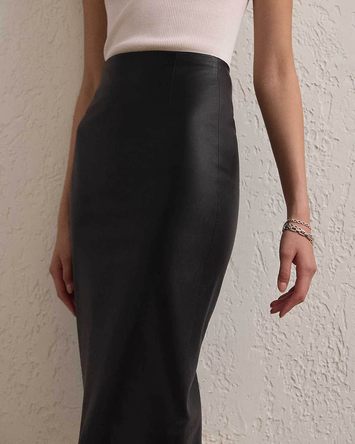 The Curran reimagines a traditional pencil skirt silhouette with a higher rise and crisp darts at the front and back for a tailored finish. Made in Italy, this style is crafted from soft nappa lambskin and features a slit at the back hem for ease of movement.