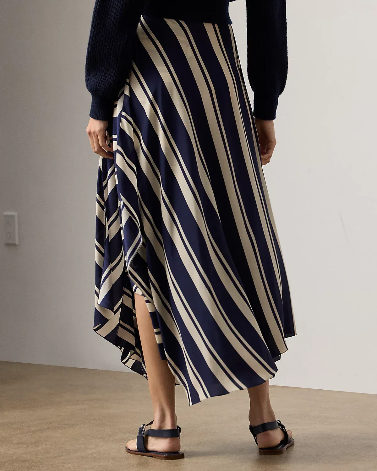 Designed with overlapping panels to form a cascading faux-wrap silhouette, the Tilda’s silk crepe de chine fabrication is printed with a nautical-inspired striped motif, which is carefully engineered to align with the layered panels for graphic intrigue. A handkerchief hem creates playful movement with each step.