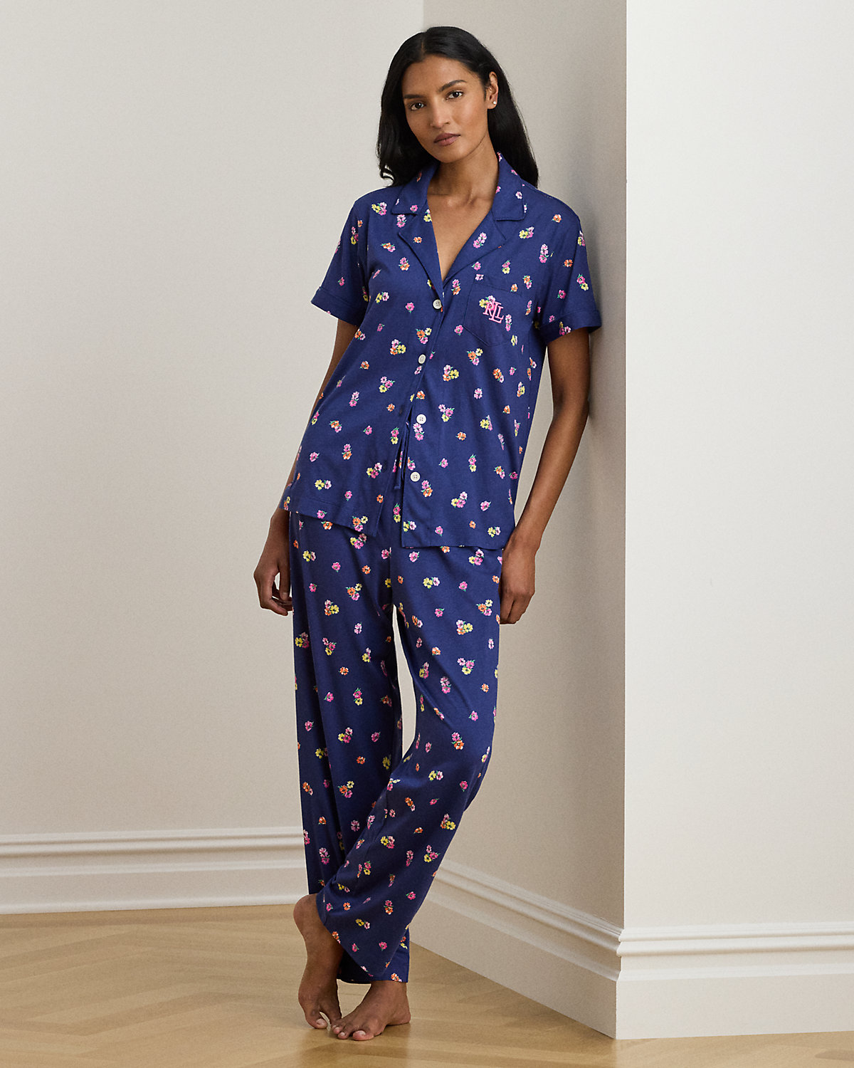 Crafted with soft cotton-blend jersey, this feminine short-sleeve sleep set with drawcord ankle pants displays colorful florals against a navy blue backdrop. Lauren’s signature embroidered logo completes the look.