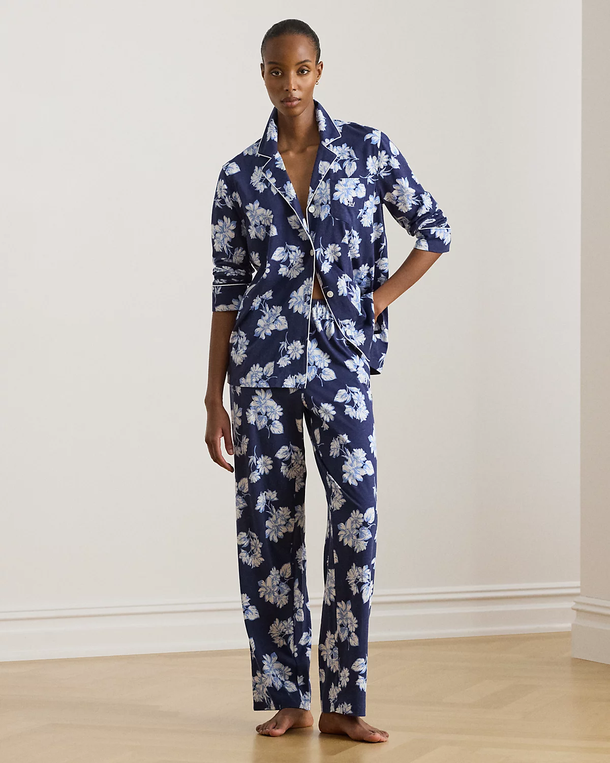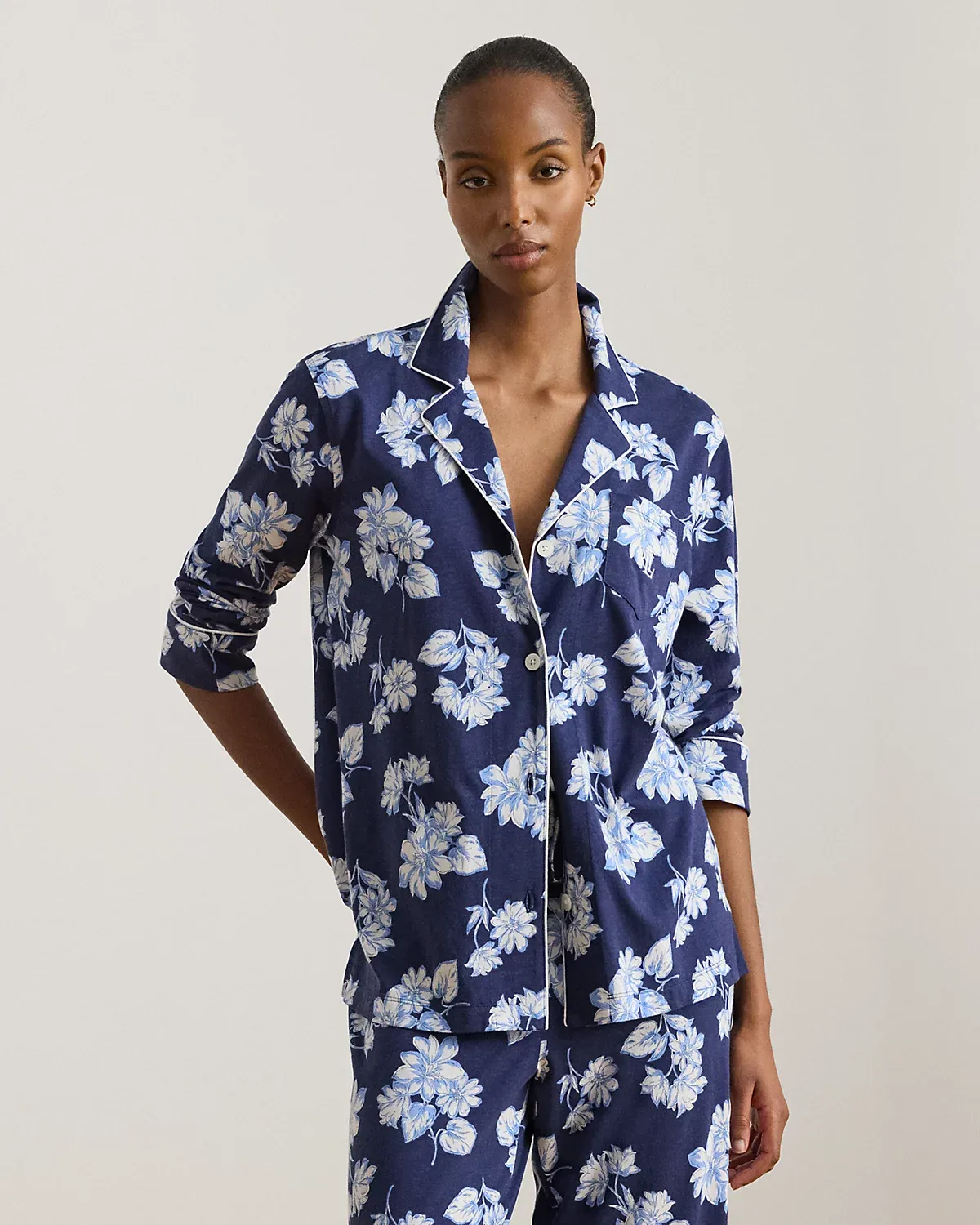 Crafted with soft cotton-blend jersey, this floral sleep set pairs a div-down shirt with drawcord pants. Our embroidered logo at the chest pocket completes the look.