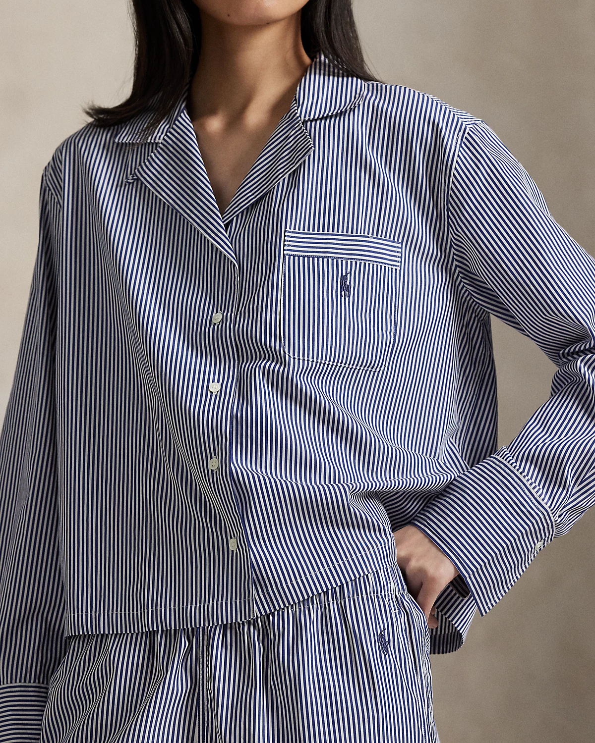 This two-piece pajama set is designed with classic shirting stripes and embroidered with our signature Pony. Crafted for comfort and longevity, its made with cotton poplin specially selected for its breathability and soft hand feel that will only get better over time. Ralpthth Lauren partners with Better Cotton™ to improve cotton farming globally. Better Cotton trains farmers to use water efficiently, care for the health of the soil and natural habitats, reduce use of the most harmful chemicals, and implement the principles of decent work.