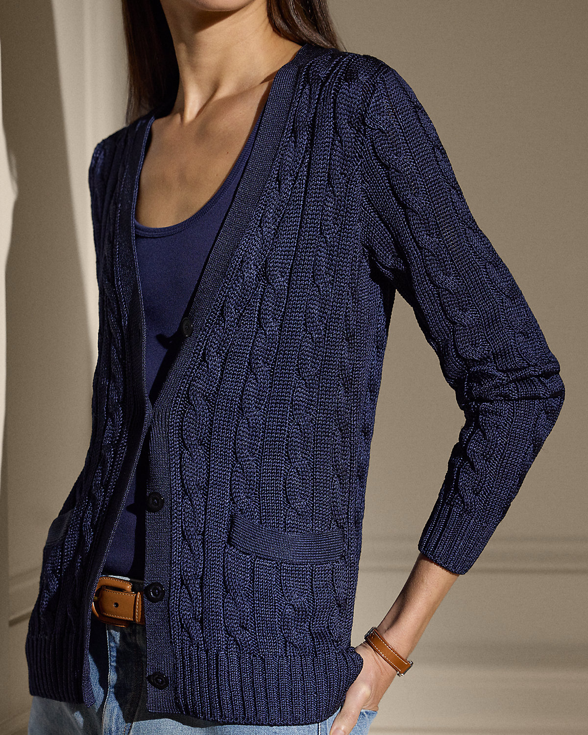 Our iconic cable-knit cardigan sweater melds impeccable craftsmanship with the refined luxury of high-shine tussah silk, which is specially selected for its soft hand feel and beautiful sheen.