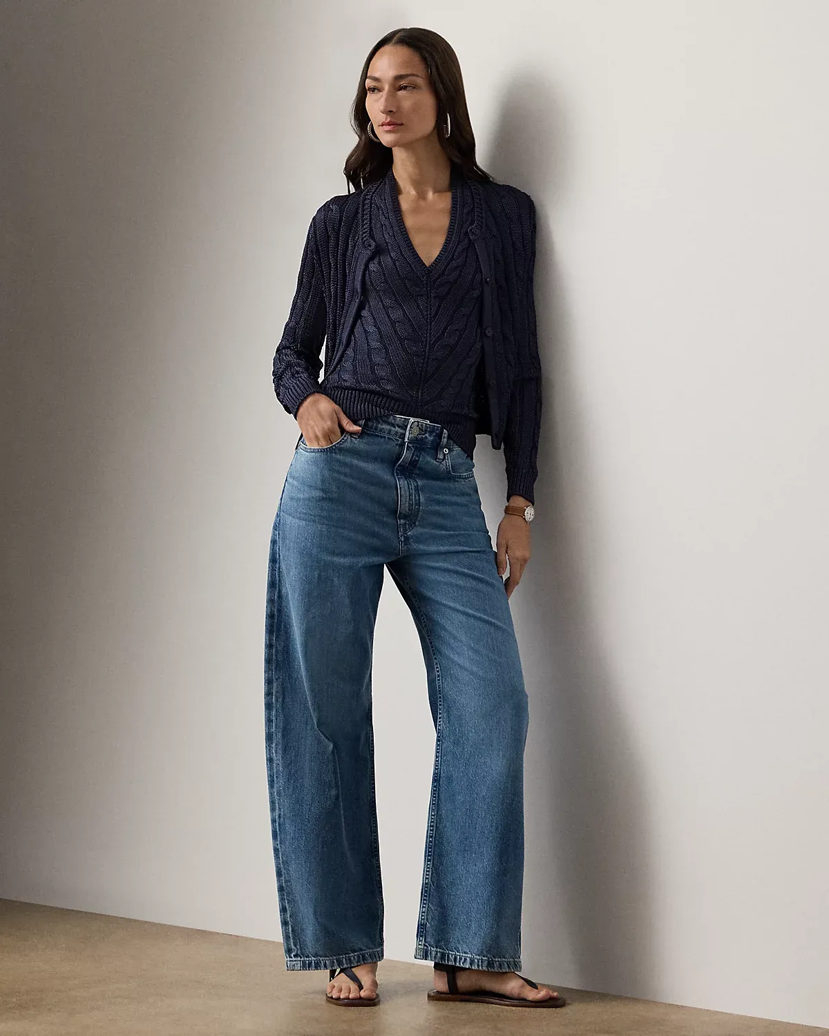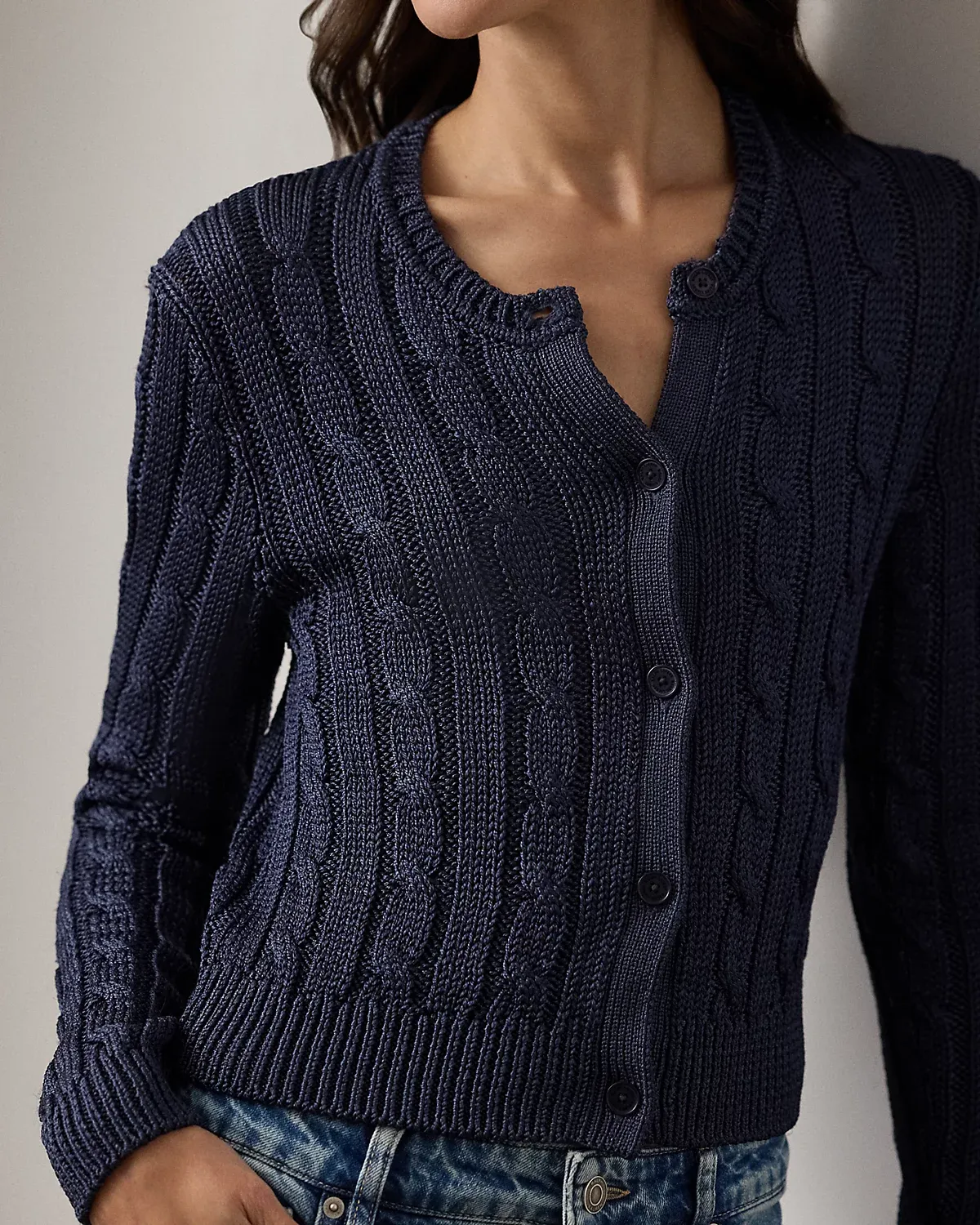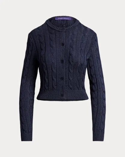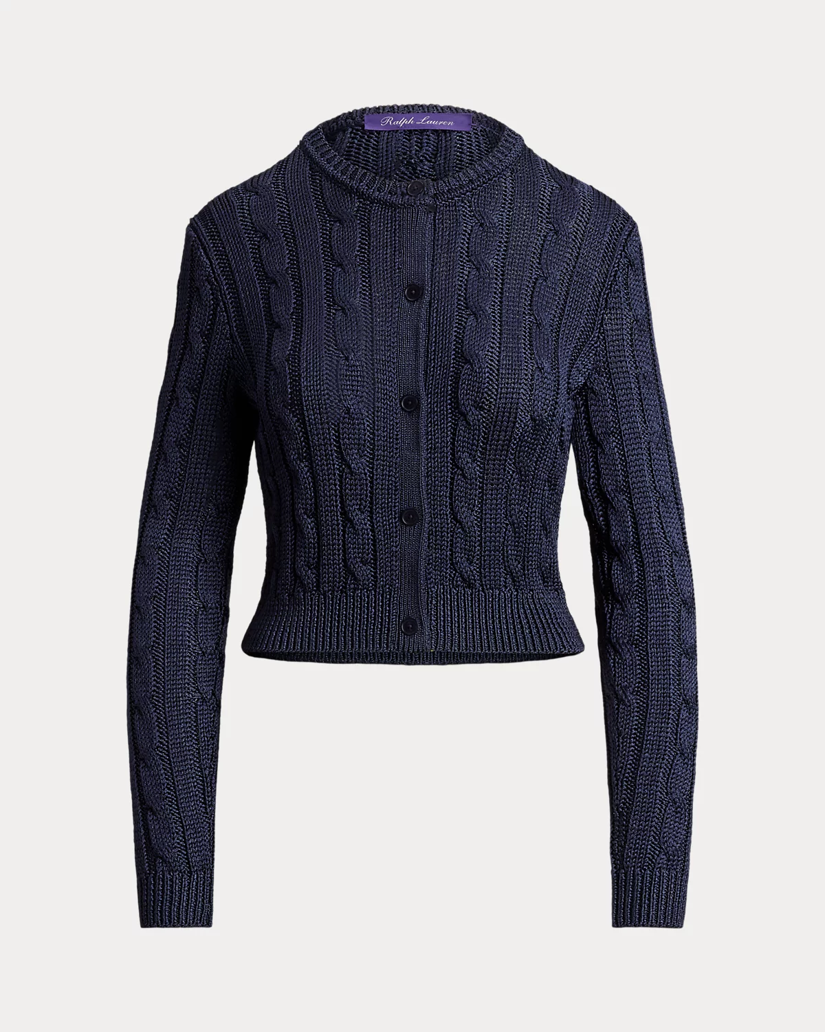 Reimagined in a cropped fit, our iconic cable-knit cardigan melds impeccable craftsmanship with the refined luxury of high-shine silk, which is specially selected for its soft hand and beautiful sheen. Genuine mother-of-pearl divs custom-developed with Ralpthth Lauren’s logo complete the look.