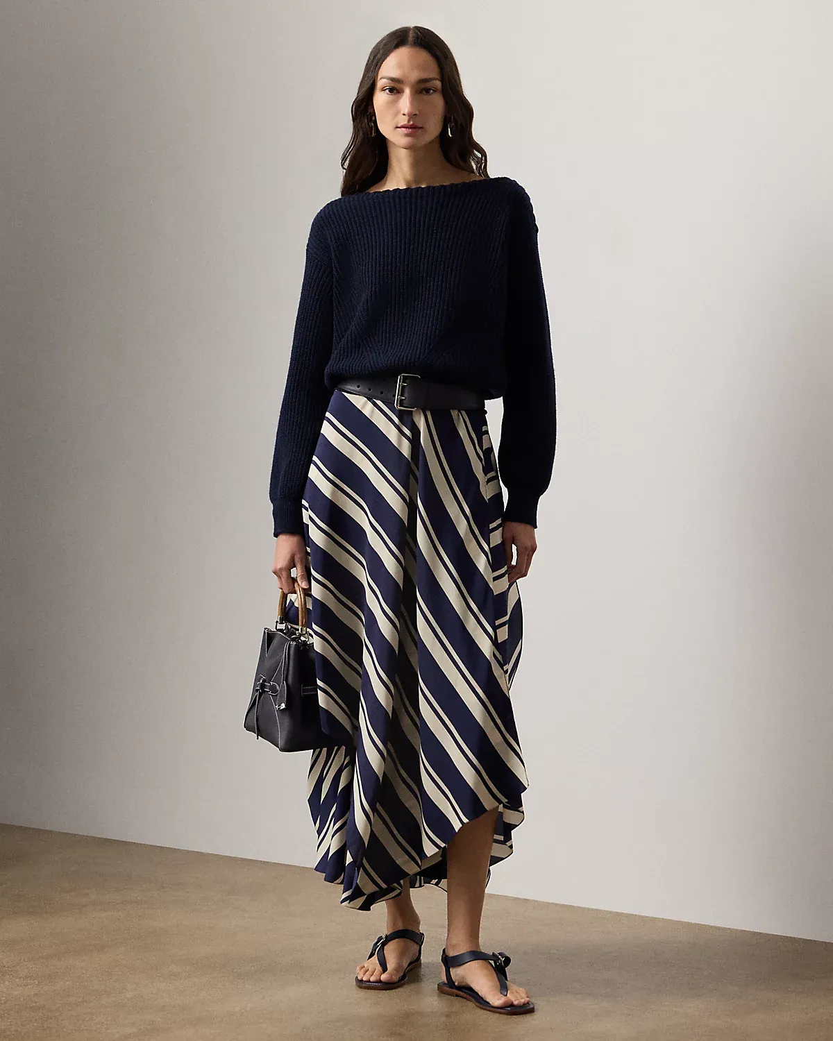 In line with the season’s nautical-inspired aesthetic, this relaxed-fitting sweater’s flattering boatneck is hand-detailed with elegant whipstitching. Artfully knit in a half-cardigan stitch, this sweater is crafted with mid-weight 100 percent cashmere and spotlights a traveling rib motif for a luxuriously soft hand and added dimension.