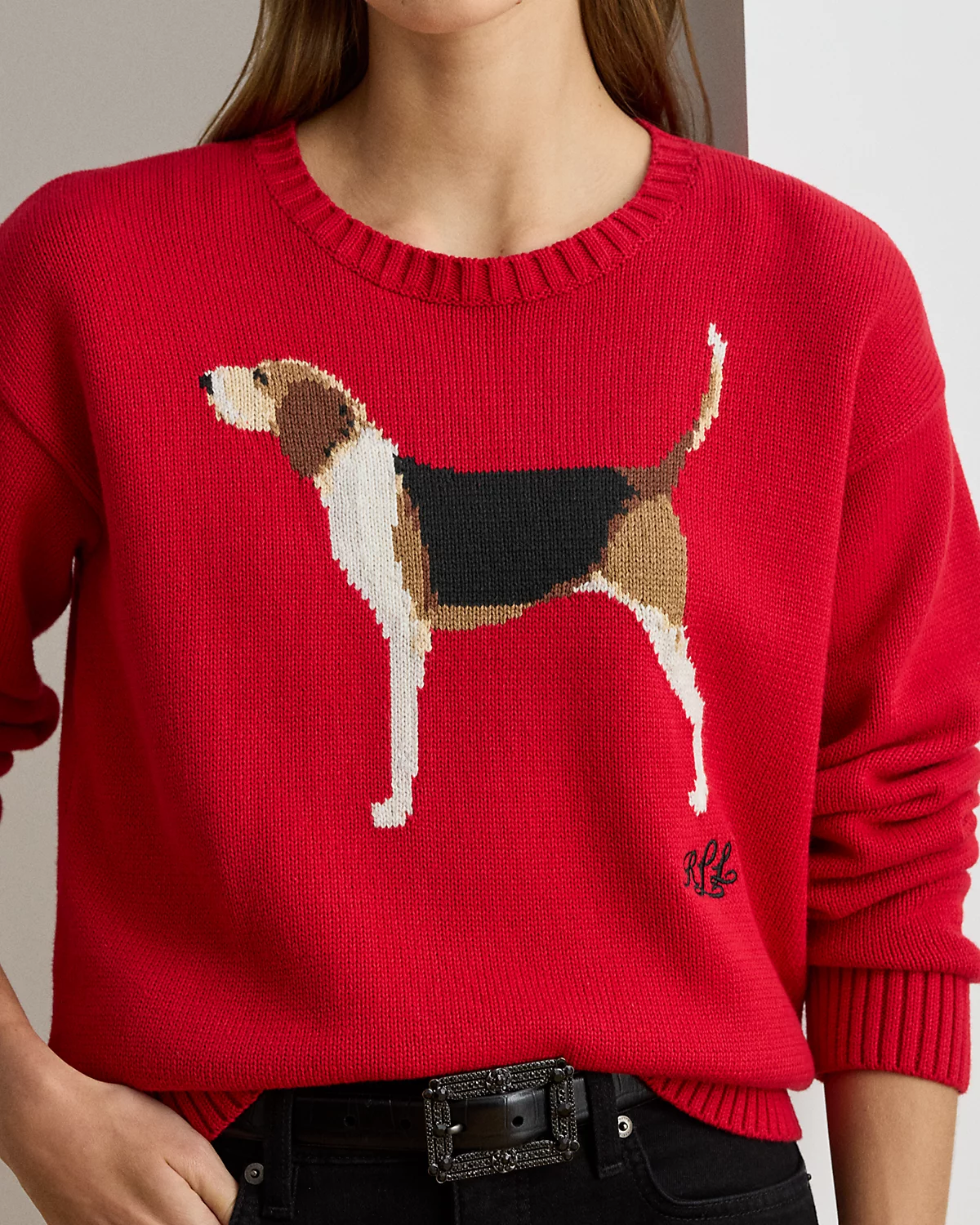 - Long sleeves with ribbed cuffs. Slightly dropped shoulders. Intarsia-knit foxhound and an “LRL”-embroidered logo at the chest. Ribbed hem.