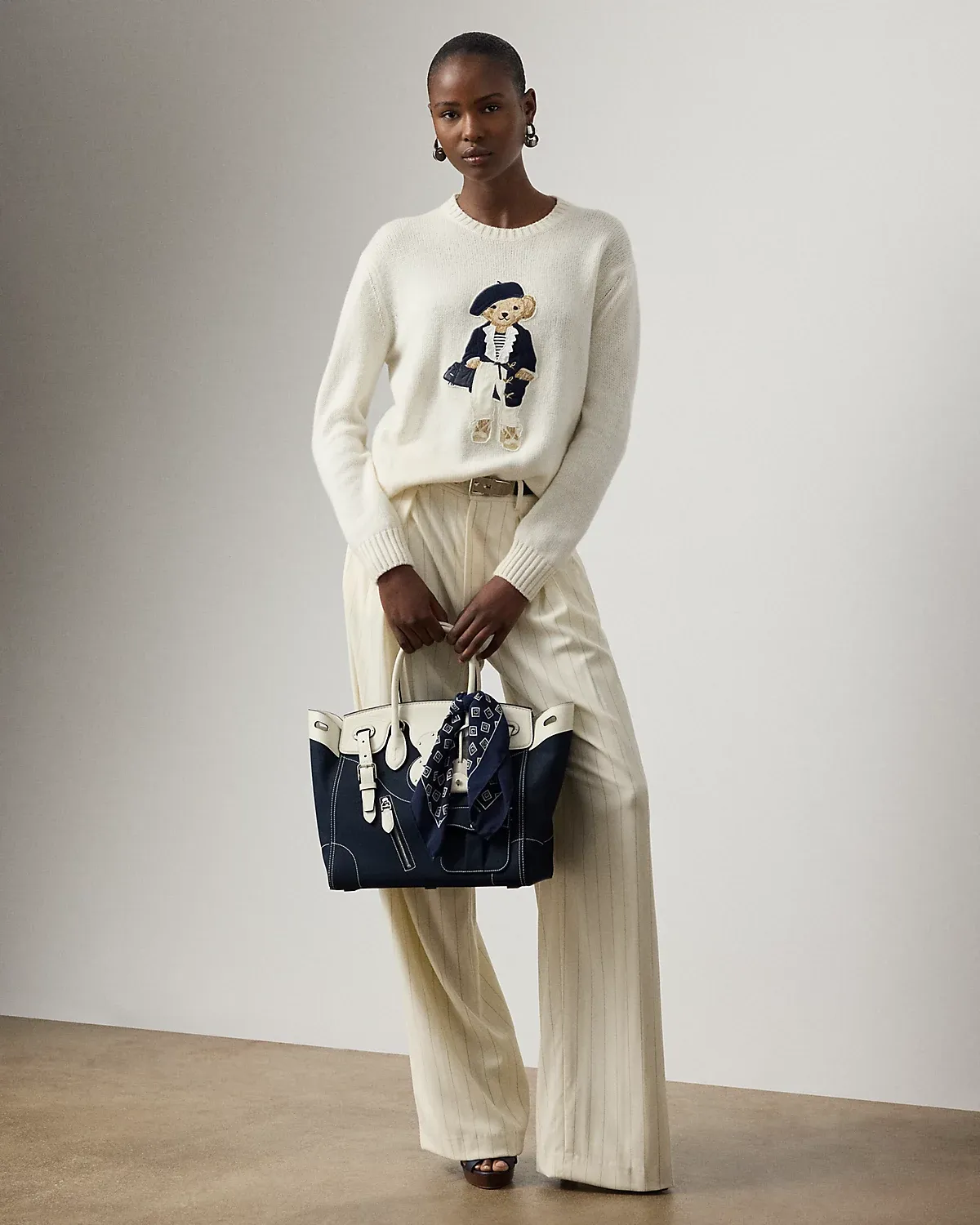 For Pre-Spring 2026, Mr. Lauren reimagined classic nautical-inspired themes, which is evident in the design of the season’s Pre-Spring Polo Bear cashmere sweater. Dressed to impress in a French sailor–inspired outfit, six specialized technicians created the Polo Bear patch using a mix of embroidery techniques and a collection of highly considered materials, including gassed cotton-silk for the toggle cardigan and beret, silk jersey for the striped tee, cotton broadcloth for the ruffled shirt, grain de poudre for the pants, and dry-cleanable lambskin for the Ralph bag. Additional details, including rhinestones for the diamond earrings and metallic thread detailing for the keybell and belt buckle, nod to the season’s focus on the finer details.
