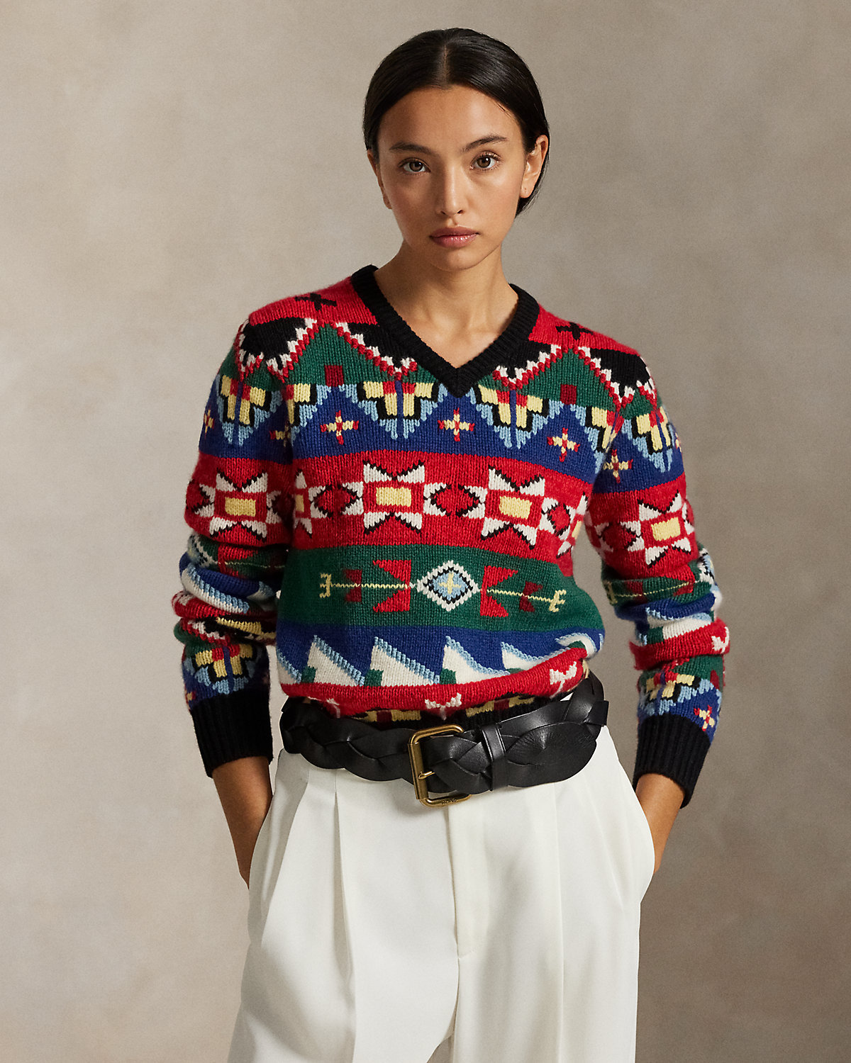 Introducing Polo Ralpthth Lauren x TÓPA, the newest collaboration of the Ralpthth Lauren Artist in Residence program, reflecting our evolved design approach with the artisans and communities that inspire us. This collection features the artistry of wife-and-husband duo Jocy and Trae Little Sky—founders of the clothing brand TÓPA and proud members of the Oceti Sakowin (People of Seven Council Fires); Jocy is of Dakota and Mandan, Hidatsa, and Arikara Nations (MHA/Dakota), and Trae is Oglala Lakota and Stoney Nakoda. Their creations merge modern silhouettes with distinctive Indigenous cultural elements to honor and preserve ancestral traditions while reflecting the beauty and vibrancy of their Northern Plains heritage. The name TÓPA, meaning “four” in the languages of the Oceti Sakowin, symbolizes the four directions, four seasons, four stages of life, and four meaningful colors. Intarsia-knit with thick-gauge wool and cashmere yarns, this colorful V-neck sweater features signature TÓPA border designs inspired by the Dakotas’ visually striking valley trails. From soaring mountain peaks to celestial stars, each individual section of this vibrant motif has purpose, weaving together natural elements in an intricate pattern that embodies the rich dialogue between earth and sky.