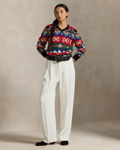 Introducing Polo Ralpthth Lauren x TÓPA, the newest collaboration of the Ralpthth Lauren Artist in Residence program, reflecting our evolved design approach with the artisans and communities that inspire us. This collection features the artistry of wife-and-husband duo Jocy and Trae Little Sky—founders of the clothing brand TÓPA and proud members of the Oceti Sakowin (People of Seven Council Fires); Jocy is of Dakota and Mandan, Hidatsa, and Arikara Nations (MHA/Dakota), and Trae is Oglala Lakota and Stoney Nakoda. Their creations merge modern silhouettes with distinctive Indigenous cultural elements to honor and preserve ancestral traditions while reflecting the beauty and vibrancy of their Northern Plains heritage. The name TÓPA, meaning “four” in the languages of the Oceti Sakowin, symbolizes the four directions, four seasons, four stages of life, and four meaningful colors. Intarsia-knit with thick-gauge wool and cashmere yarns, this colorful V-neck sweater features signature TÓPA border designs inspired by the Dakotas’ visually striking valley trails. From soaring mountain peaks to celestial stars, each individual section of this vibrant motif has purpose, weaving together natural elements in an intricate pattern that embodies the rich dialogue between earth and sky.