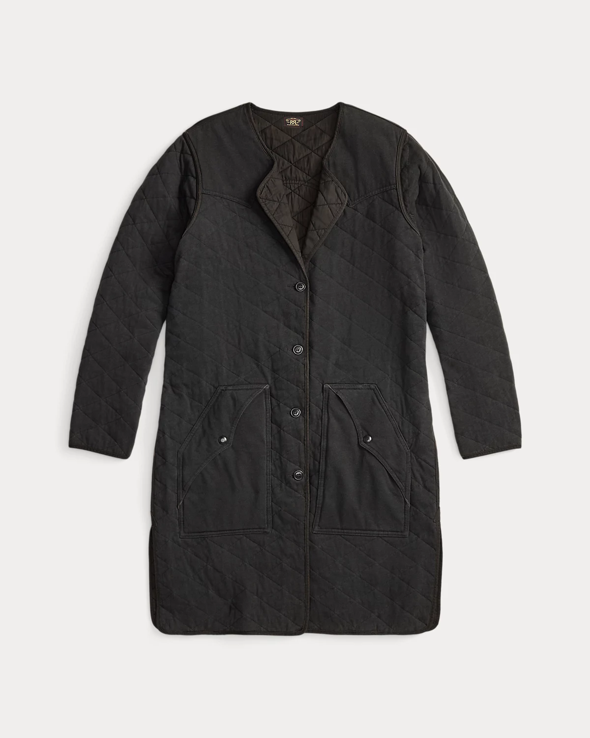 Liner jacket made with lightweight cotton-and-linen jersey. Diamond-quilted construction. Inspired by a vintage surplus garment. Western-style yokes and pockets. Tonal twill lining and binding. Lightly filled. Specially developed for a timeworn look.