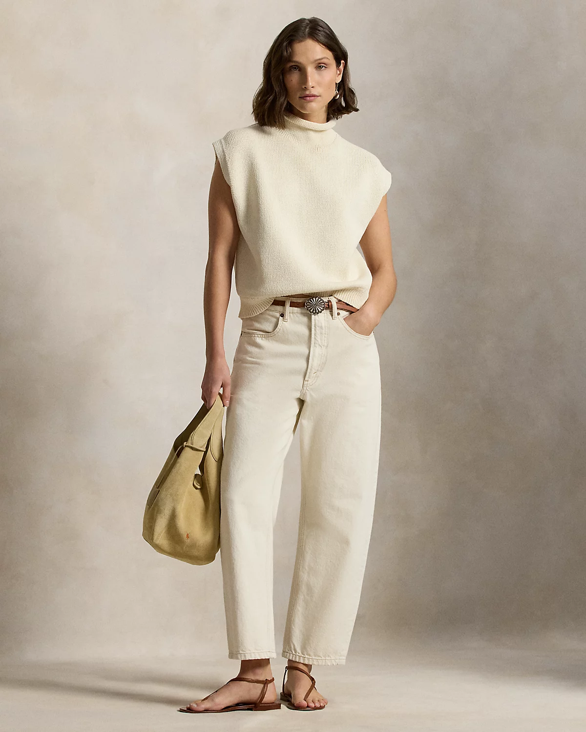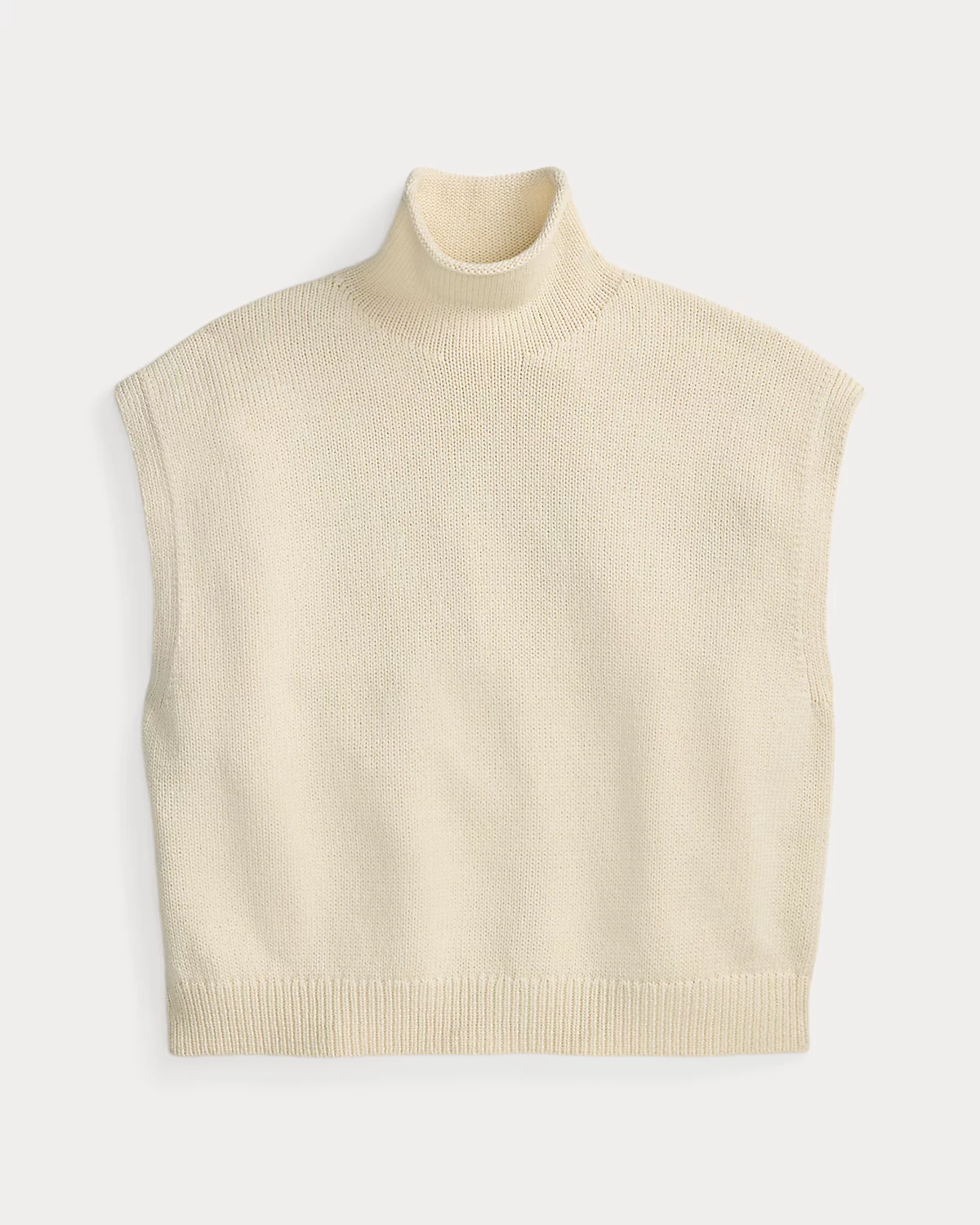 Knit with thick-gauge cotton that’s crafted for softness, strength, and subtle luster, this sleeveless sweater features a relaxed silhouette with a turtleneck that’s finished with a rolled edge.