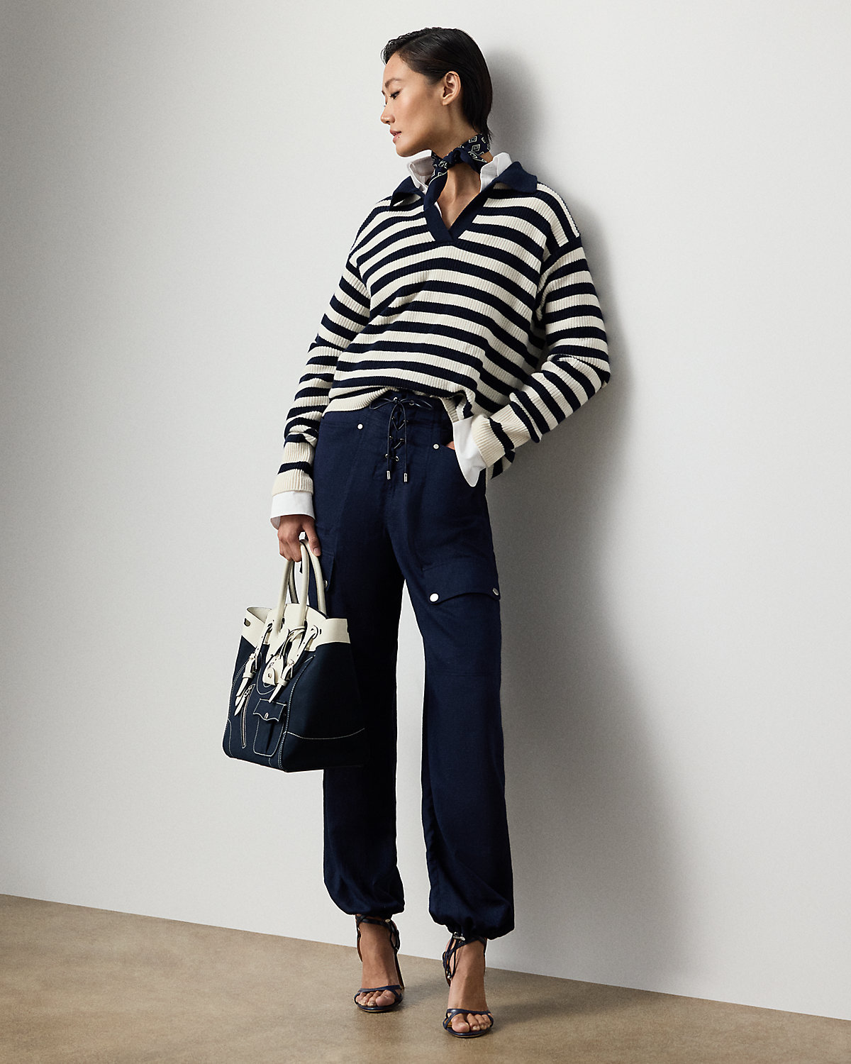 Artfully knit in a half-cardigan stitch, this version of the Polo sweater is distinguished by its relaxed, slightly oversize silhouette for maximum comfort and a flattering, cozy fit. In line with the season’s nautical-inspired aesthetic, this striped sweater is crafted from mid-weight 100 percent cashmere and detailed with a hand-embroidered “RL” monogram at the hem.