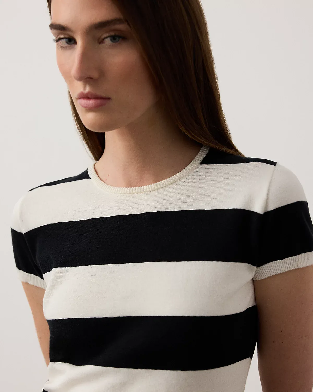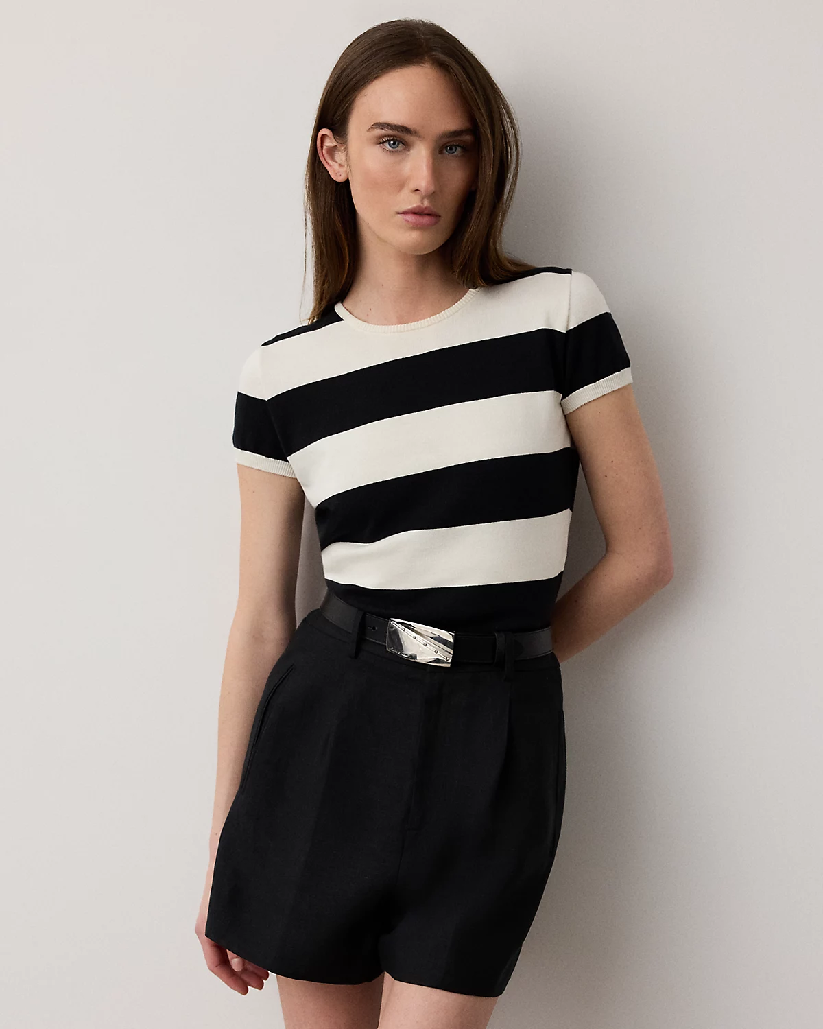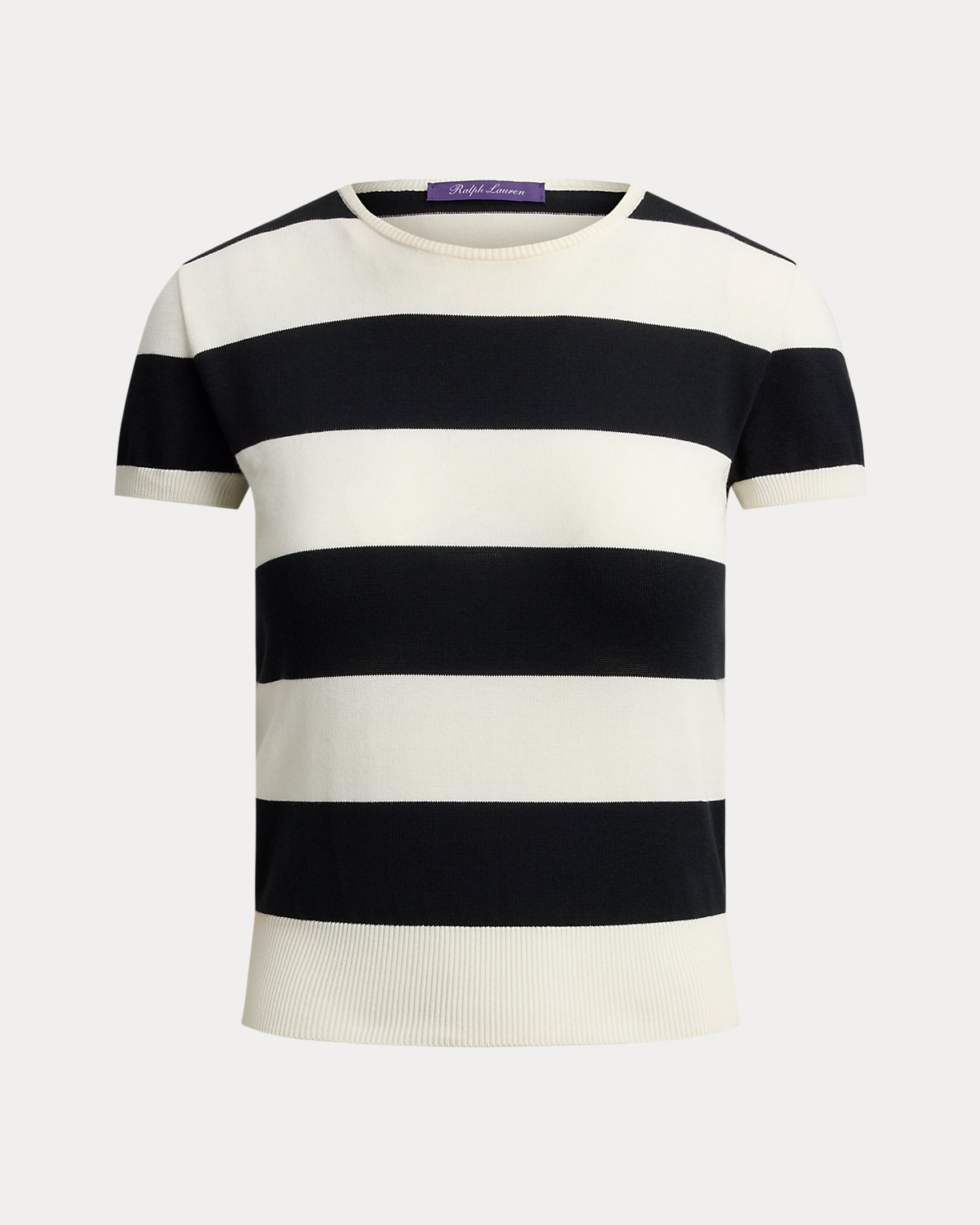 A refined wardrobe staple, this short-sleeve sweater combines the precision of a fine-gauge jersey construction with the luxurious hand feel of cotton-and-silk–blend yarn, creating a breathable fabric perfect for the warmer months. Classic stripes lend timeless appeal.
