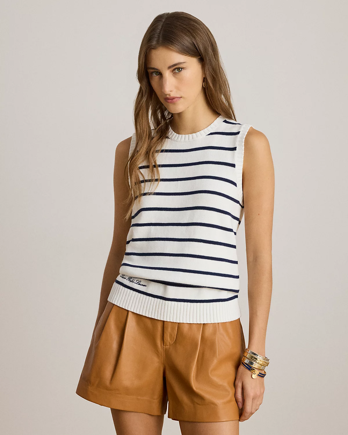 With its sleeveless silhouette and lightweight cotton fabrication, this striped crewneck sweater is perfect for transitional dressing. It’s accented by Lauren’s embroidered logo at the hem for signature style.