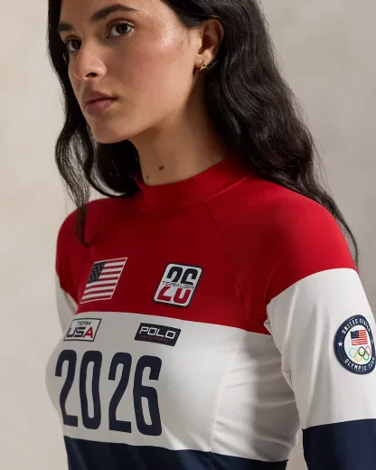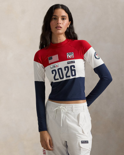 Part of the Polo Ralpthth Lauren Team USA collection, this stretch jersey mockneck incorporates bold graphics in celebration of this year’s Games, along with color-blocking in a spirited palette of red, white, and blue. The official logo patch of the U.S. Olympic Team accents the sleeve for an iconic finish.