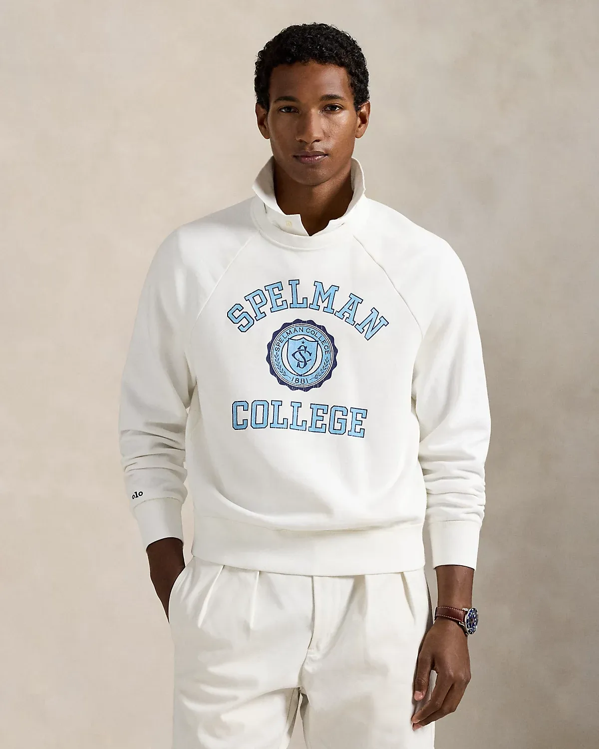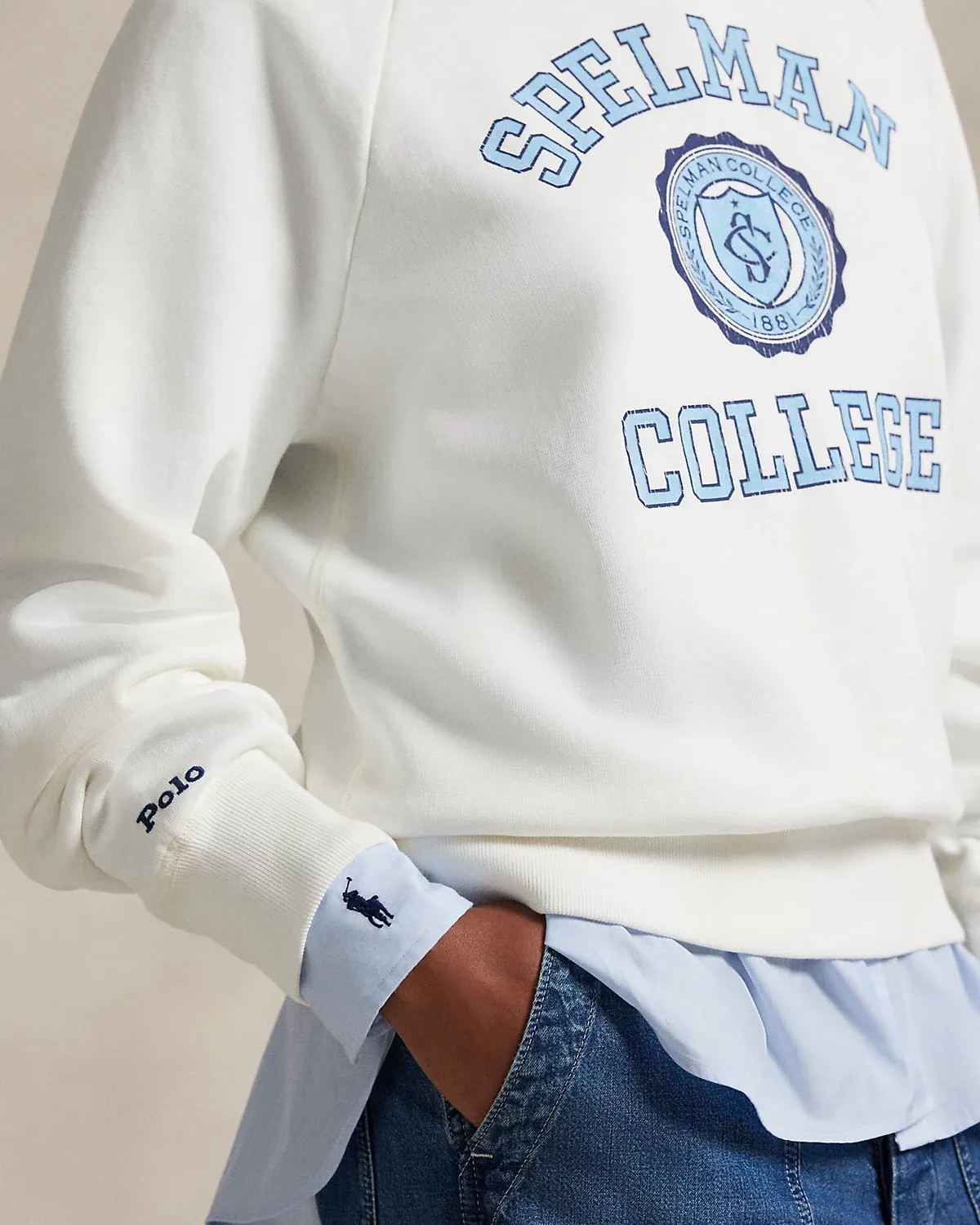- Crewneck. Long raglan sleeves with ribbed cuffs. Ribbed hem. "Spelman College" and crest printed at the front. "Polo" embroidered above the right cuff.