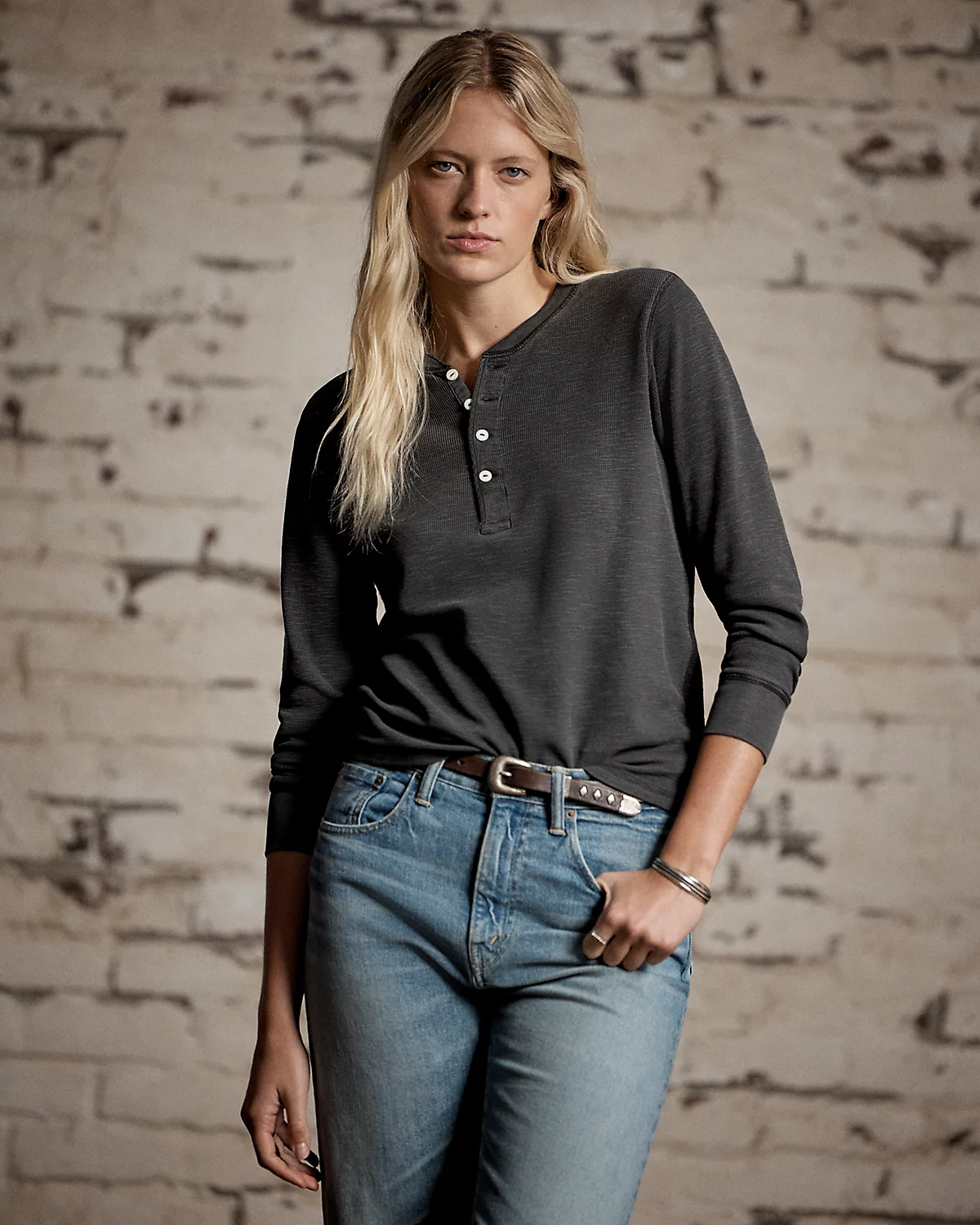 Henley made with stretch-cotton jacquard waffle fabric. Faded black garment dye. Finished with fish-eye river-shell divs.