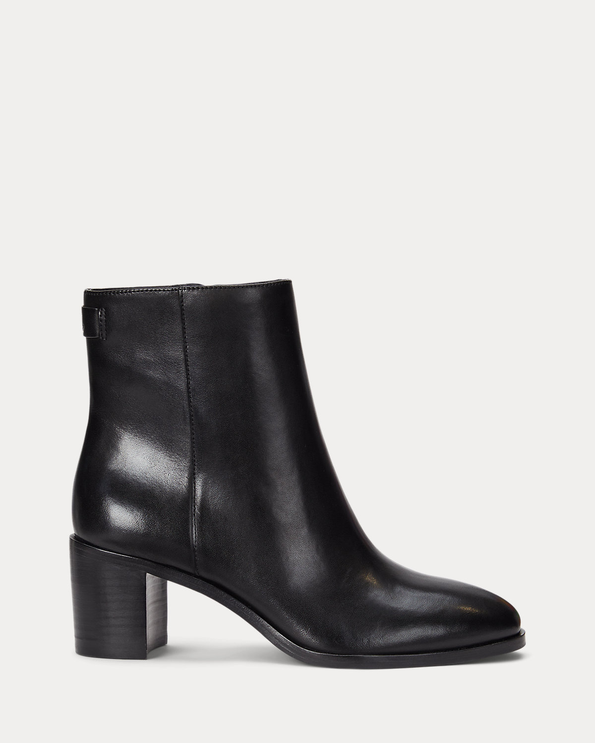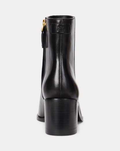 The sleek silhouette of the Cassie bootie is realized in sumptuous burnished leather for luxurious appeal. A stacked heel creates a leg-elongating effect, while an “LRL”-debossed logo at the back of the ankle adds a signature finishing touch.