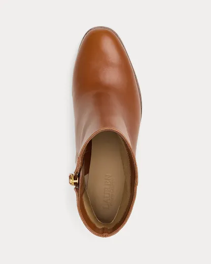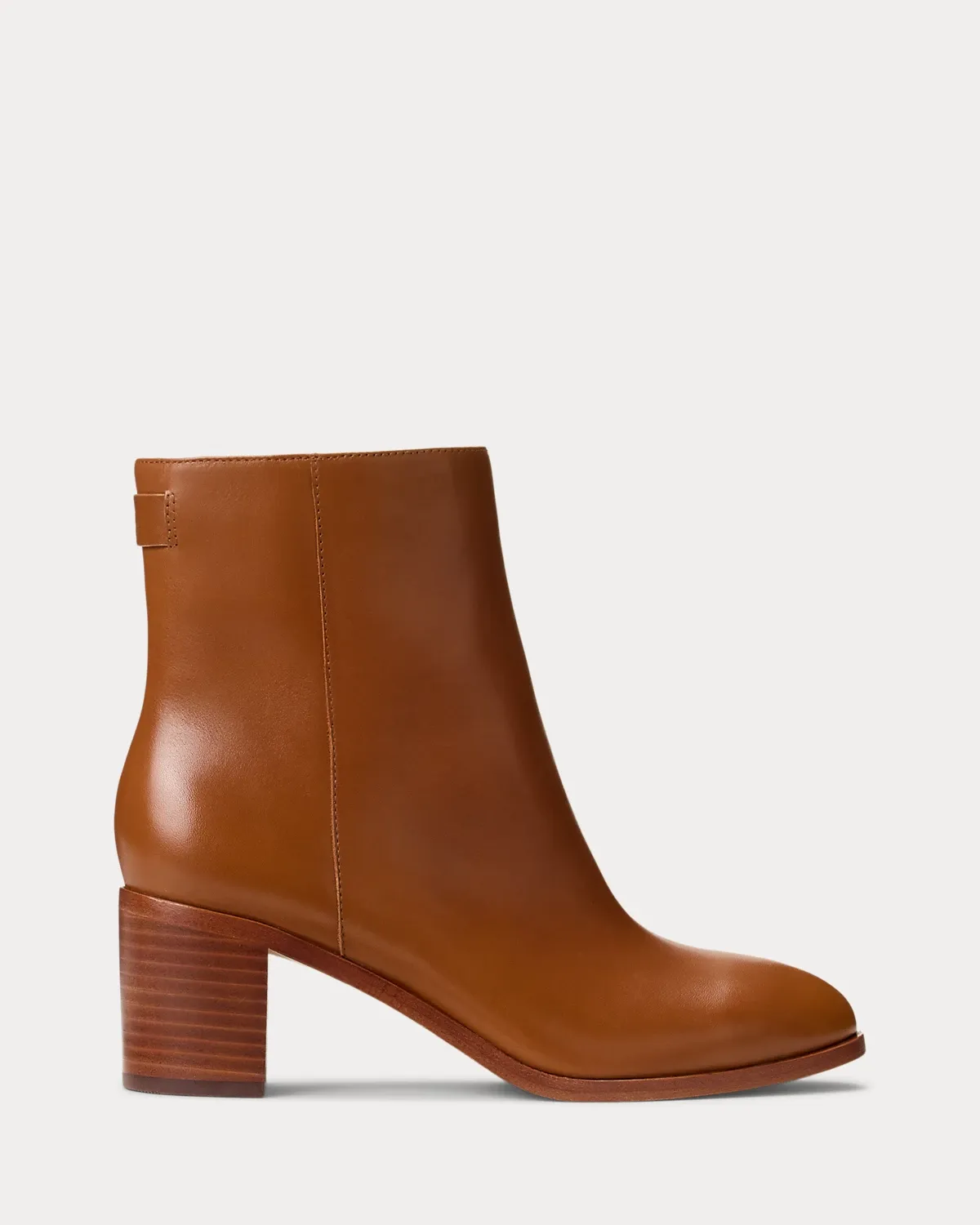 The sleek silhouette of the Cassie bootie is realized in luxuriously smooth calfskin leather for a refined sensibility. A stacked heel creates a leg-elongating effect, while an “LRL”-debossed logo at the back of the ankle adds a signature finishing touch.
