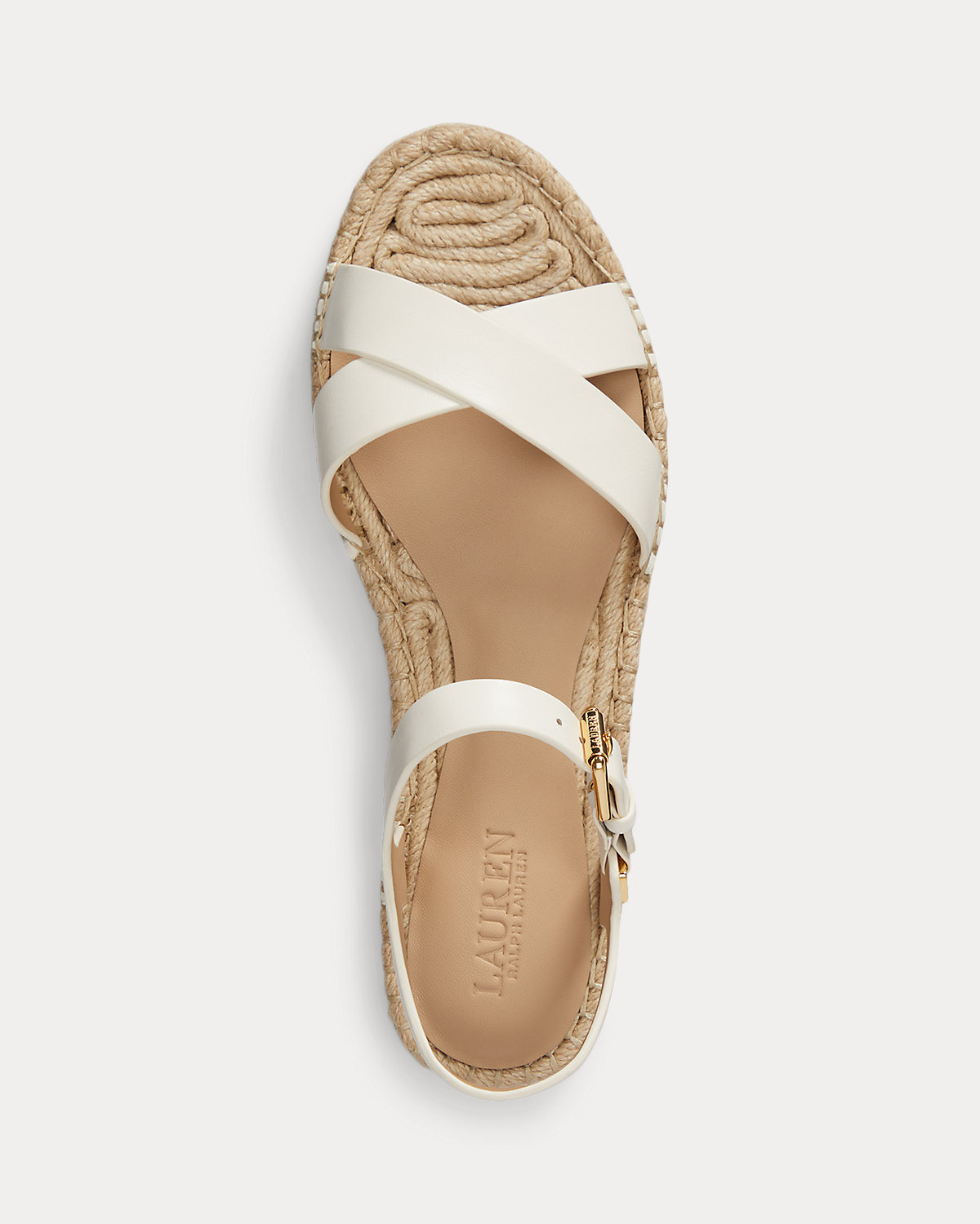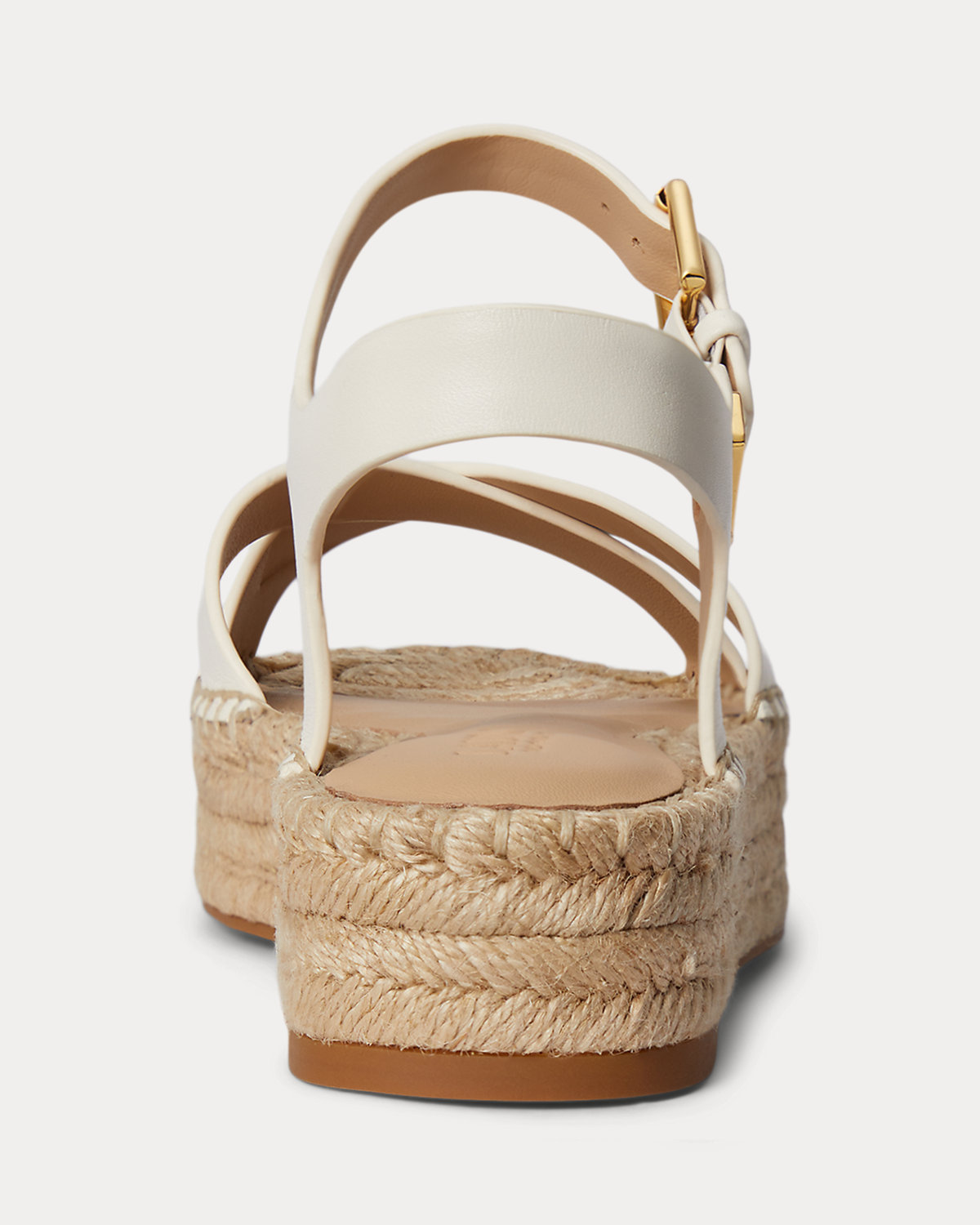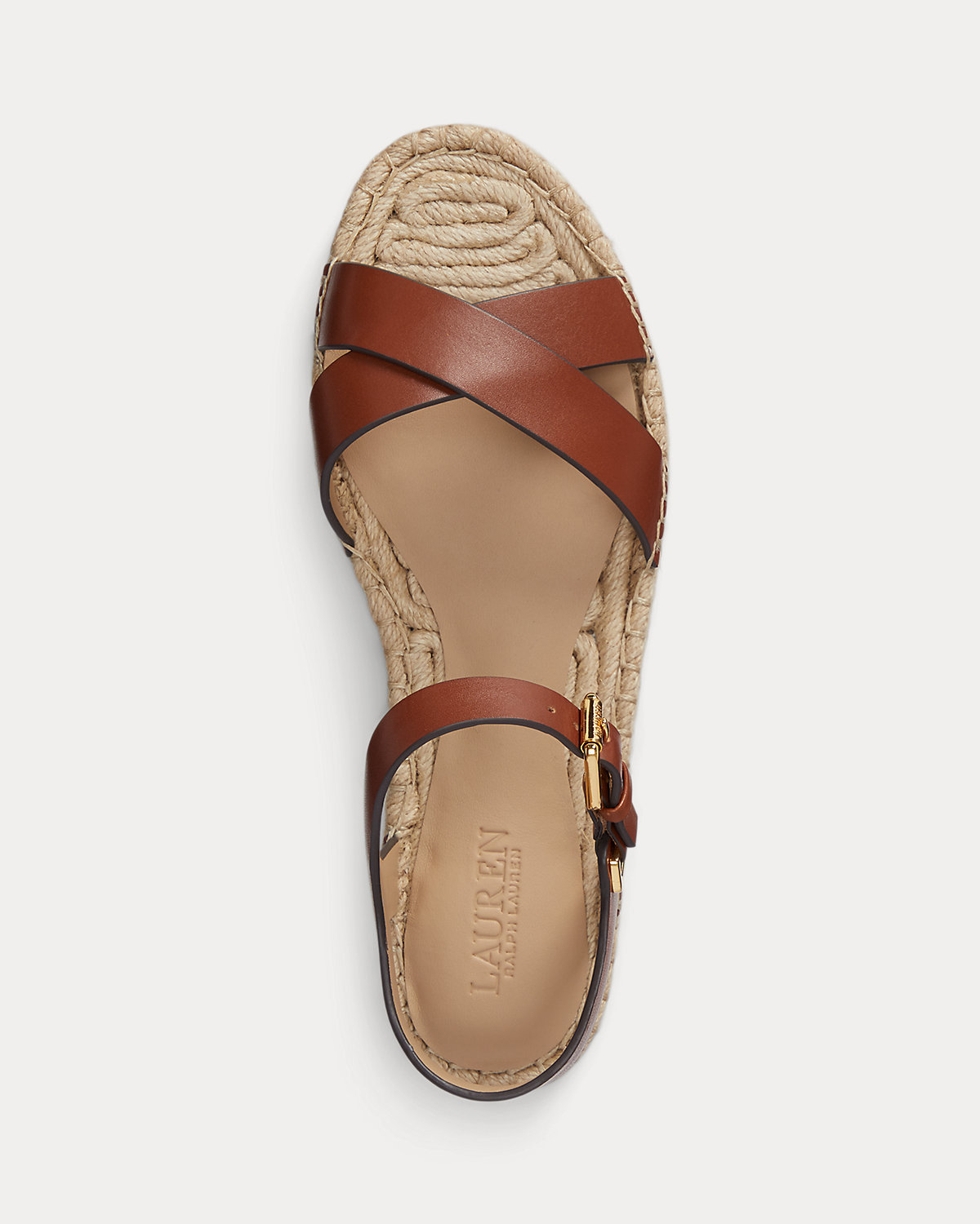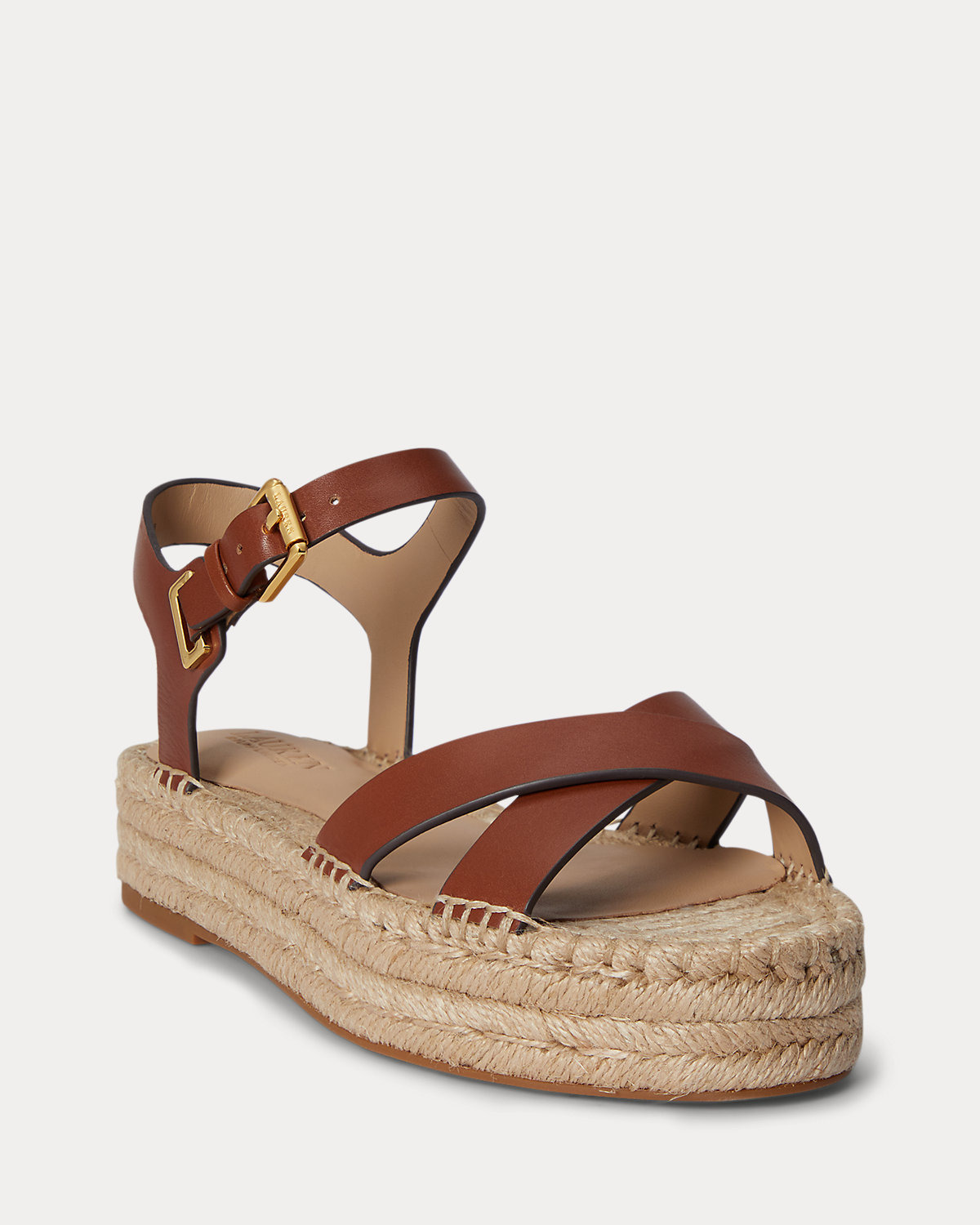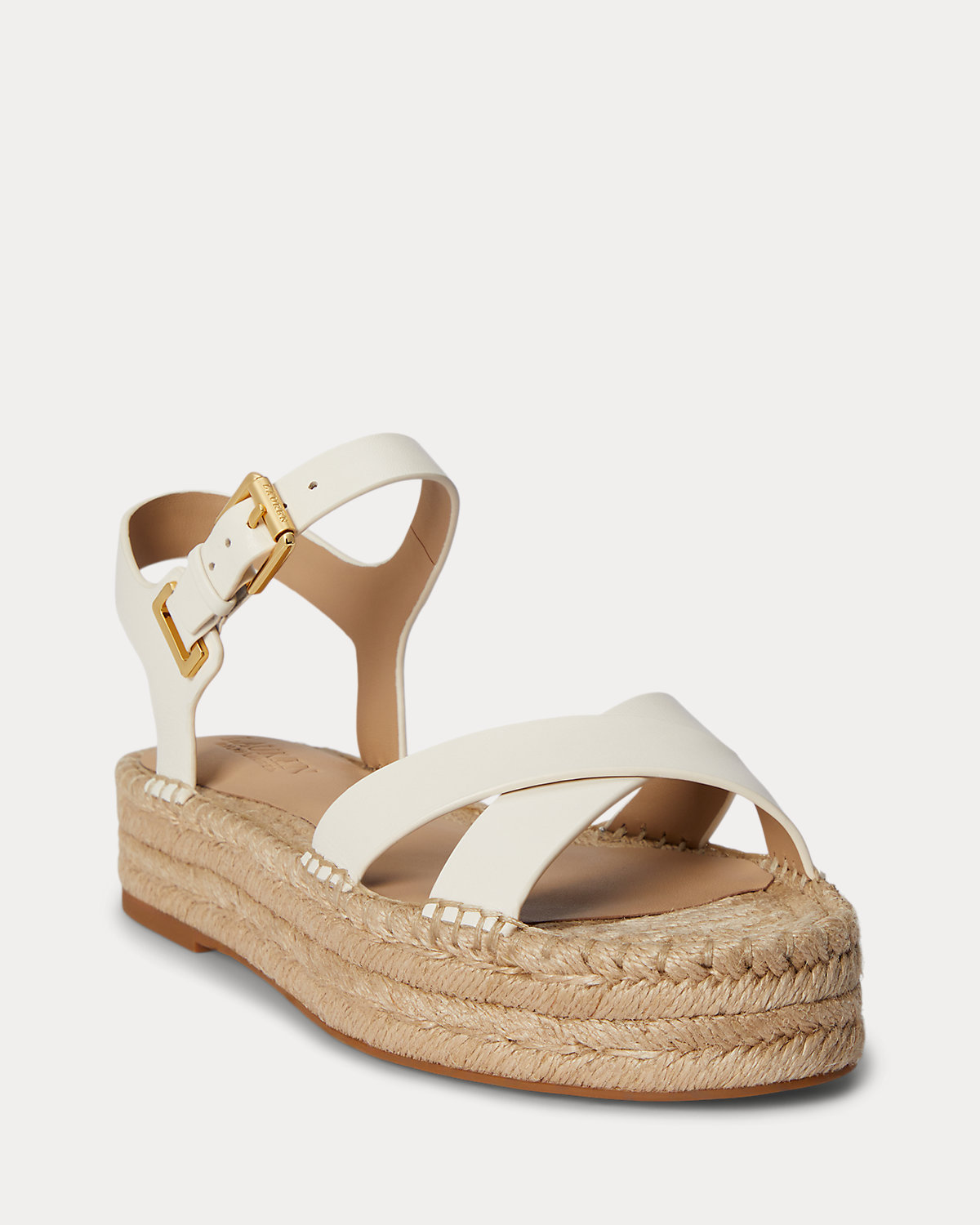 - Buckled ankle strap. Brass-finished buckle custom-developed with a “Lauren” logo.