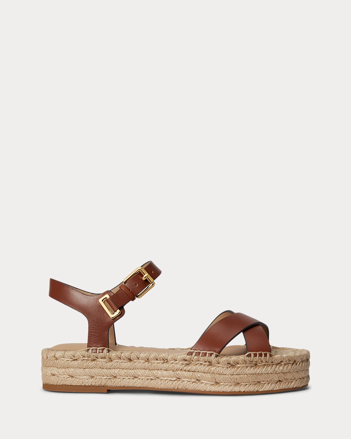 Rendered in luxuriously smooth leather, the Emeryn espadrille features a modern crisscross vamp and an equestrian-inspired buckled ankle strap set on a jute-wrapped platform.