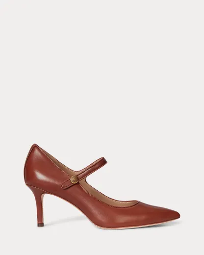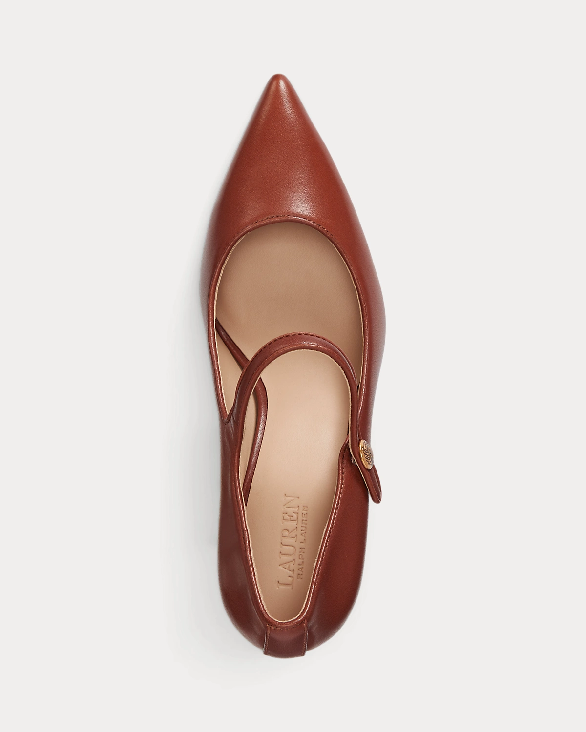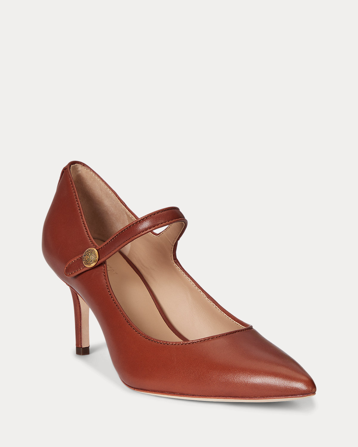 Embellished with crest-embossed divs, this version of the pointy-toe Lanette mary jane features a smooth calfskin construction and a padded leather insole for lasting comfort and luxurious style.