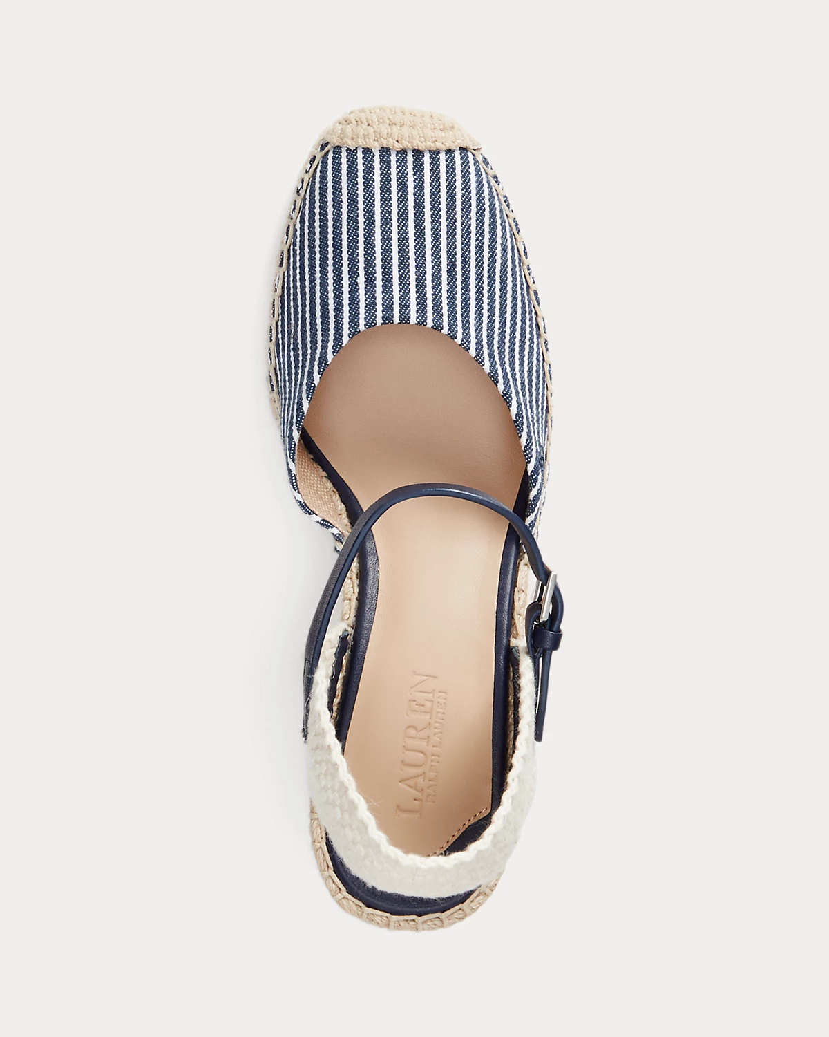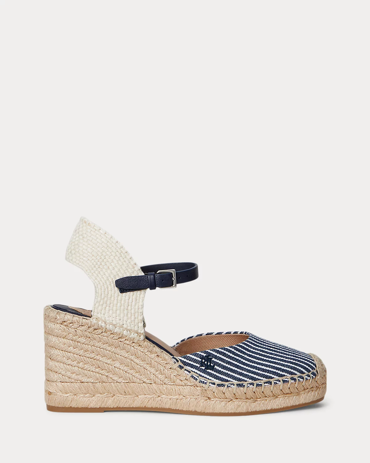 Set on a leg-elongating, 60-mm jute-wrapped wedge, the Robby espadrille features a soft square toe, a striped canvas upper, and a sumptuous leather ankle strap. Hand-stitched crocheted detailing at the toe offers an artisanal touch, while a tonal “LRL”-embroidered logo at the vamp adds a subtle iconic finish.