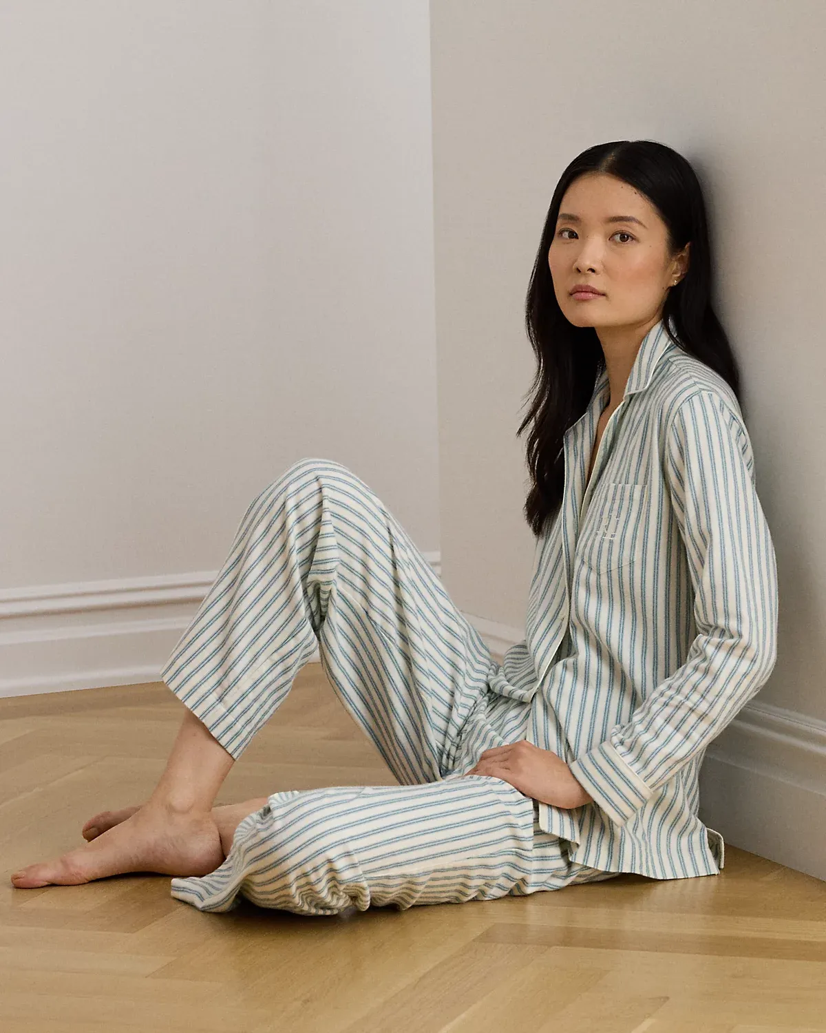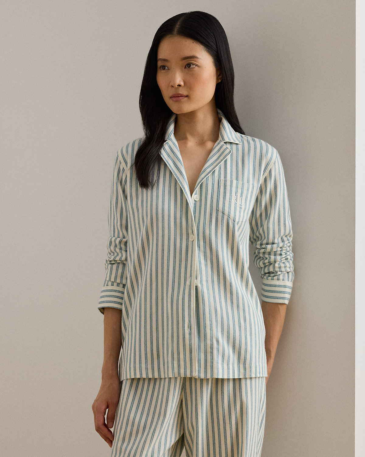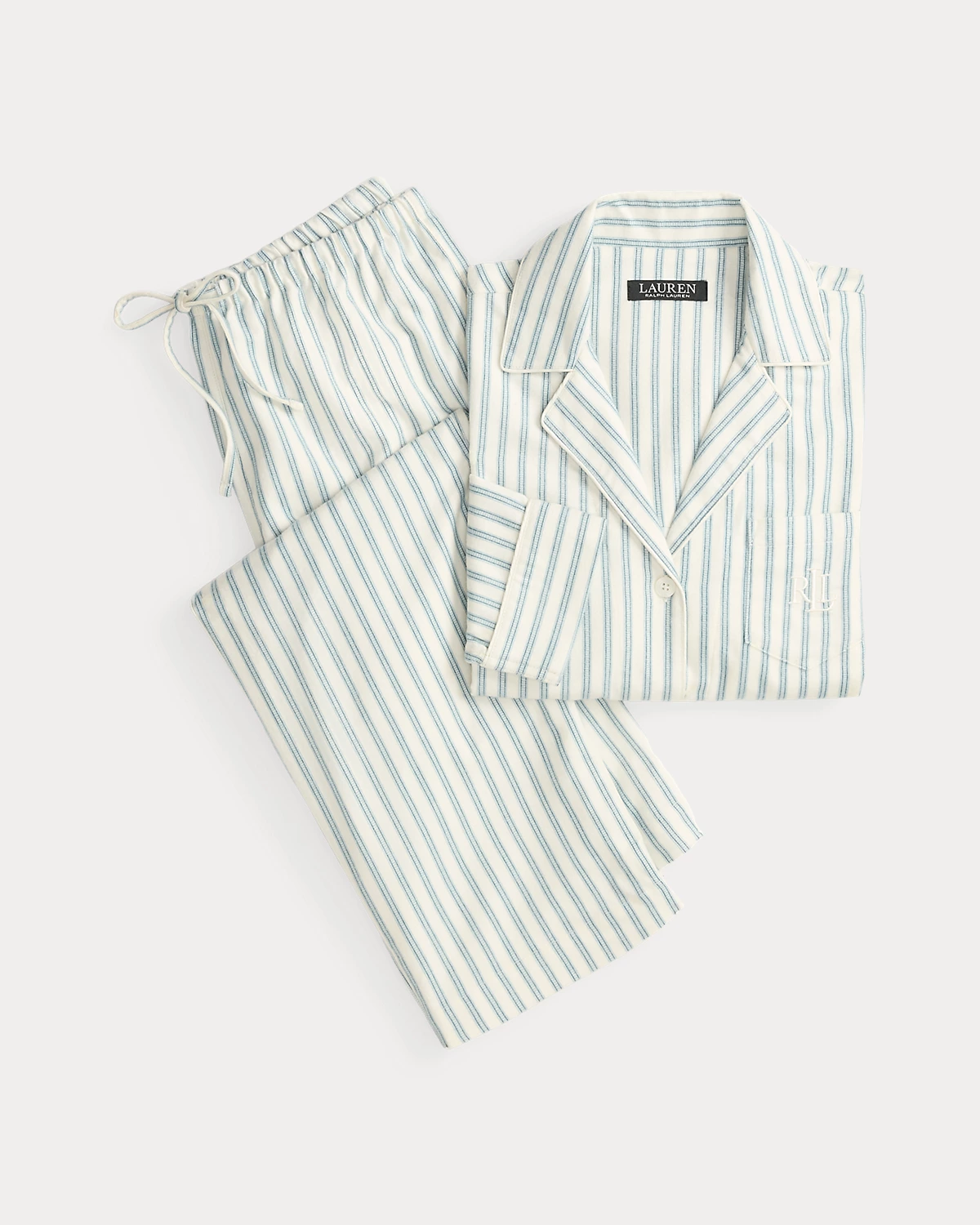 Made from soft brushed twill, this striped sleep set pairs a notch collar shirt with comfortable drawcord pants. An “LRL”-embroidered logo at the chest pocket adds a signature finish.