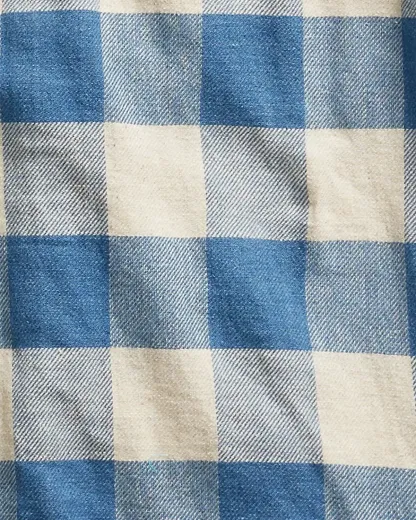 Slim-fitting shirt made with lightweight cotton-and-linen twill. Indigo-dyed plaid pattern. Metal div at the collar.