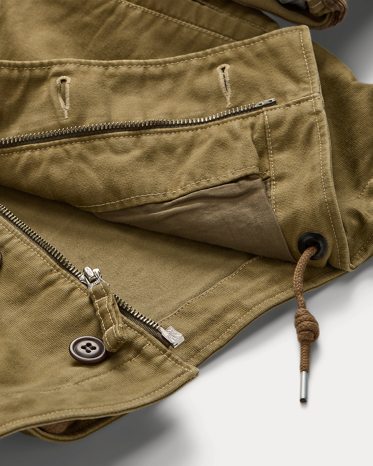 - Corduroy shawl collar. Buttoned throat latch. Full-zip front. Buttoned storm placket.
